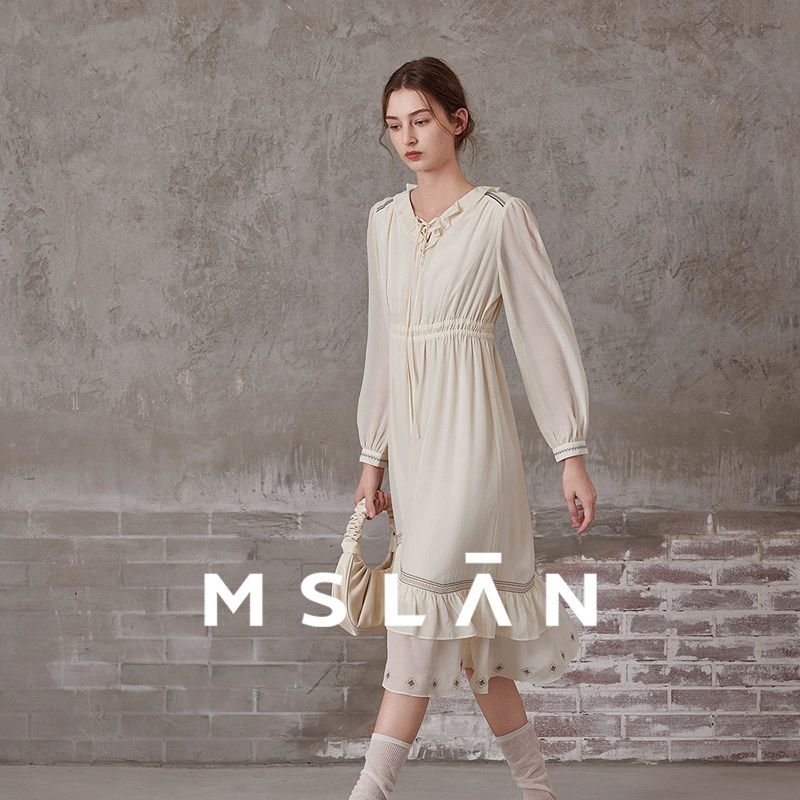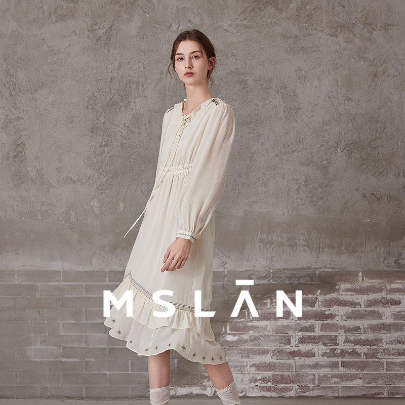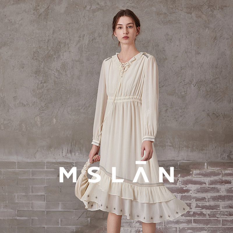 MSLAN商场同款春季浪漫领口系带收腰荷叶边连衣裙MFCE4130
