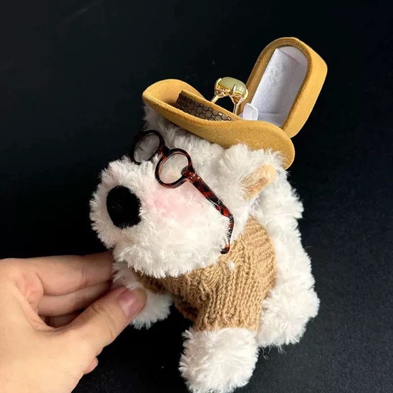创意文艺风西高地小狗毛绒公仔戒指盒可爱卡通玩偶摆件收纳首饰盒