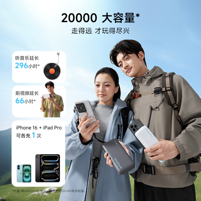 【国家3C认证】充电宝CP24电能块大容量自带线40W移动电源20000毫安时PD快充适用于小米苹果15/16/17Pro Max