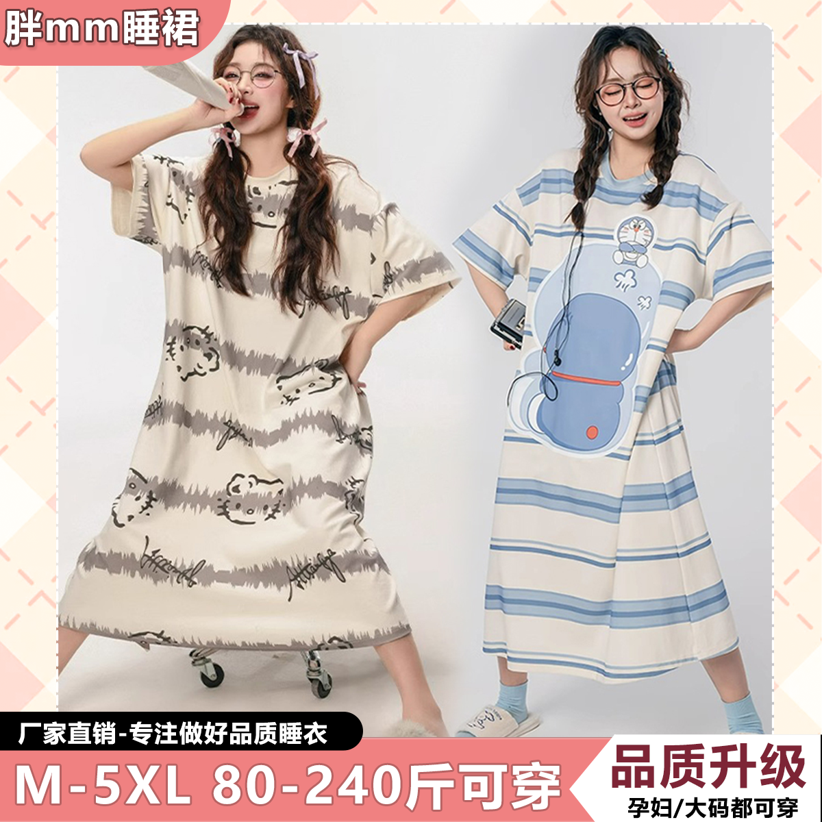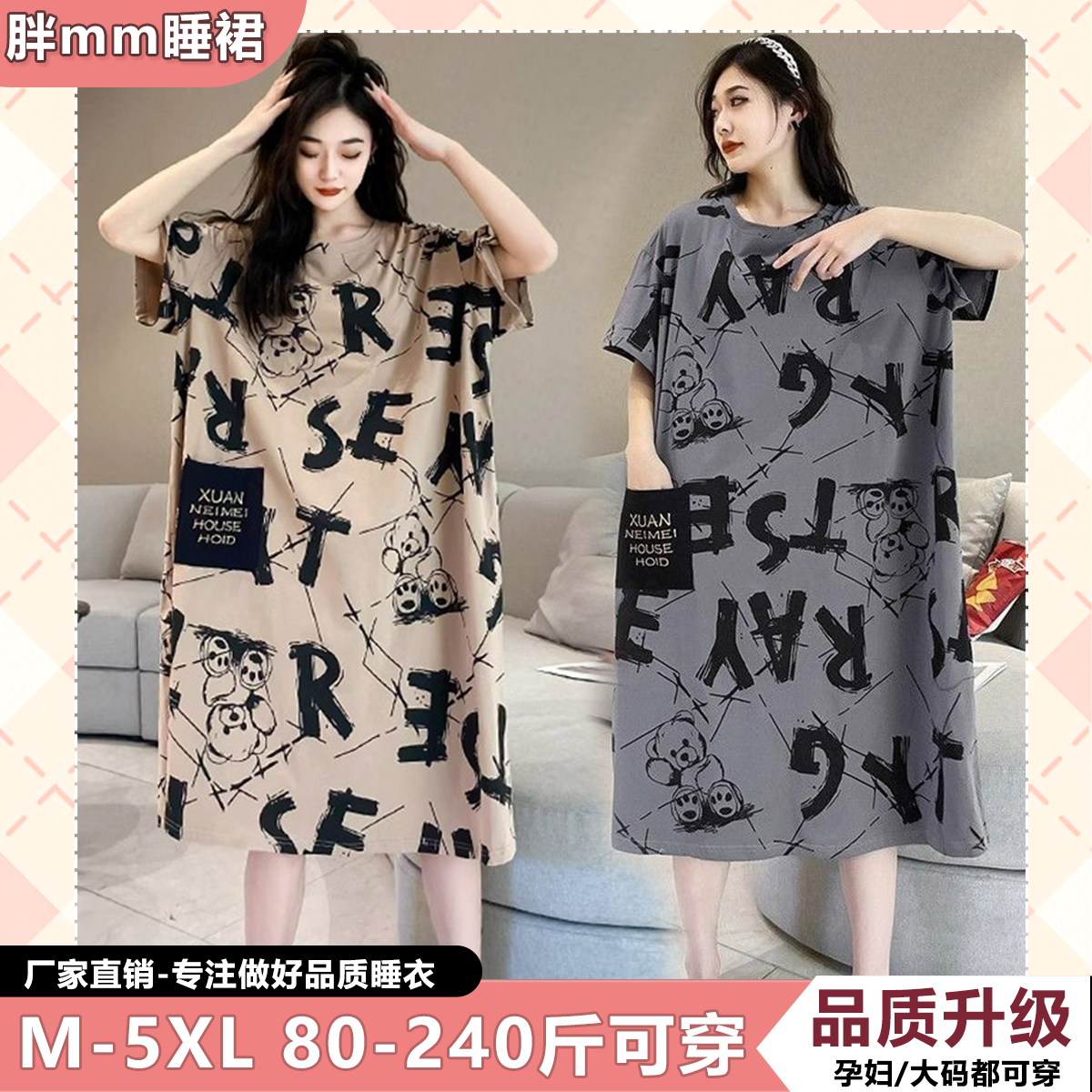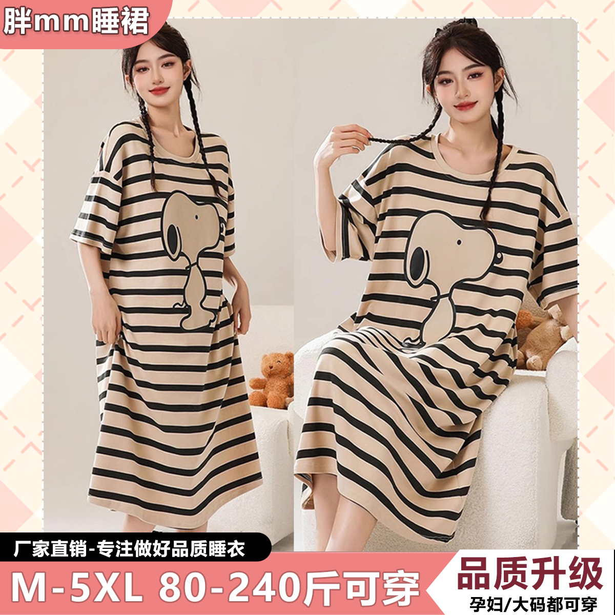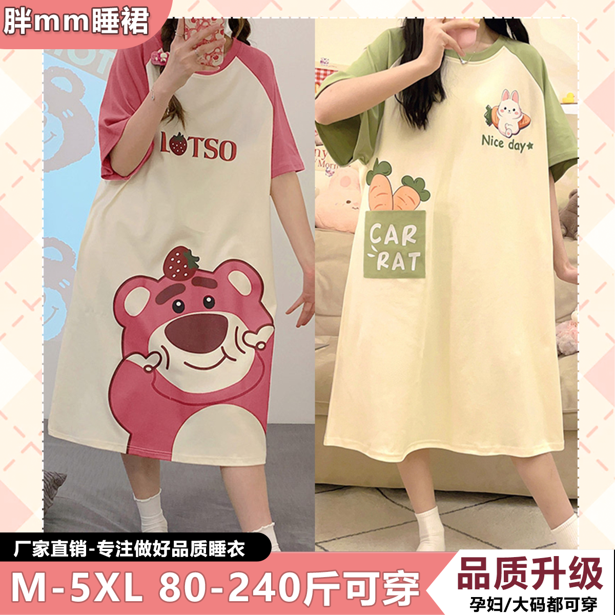 胖mm纯棉睡裙女夏加肥加大卡通学生长款T恤裙睡衣300斤孕妇连衣裙