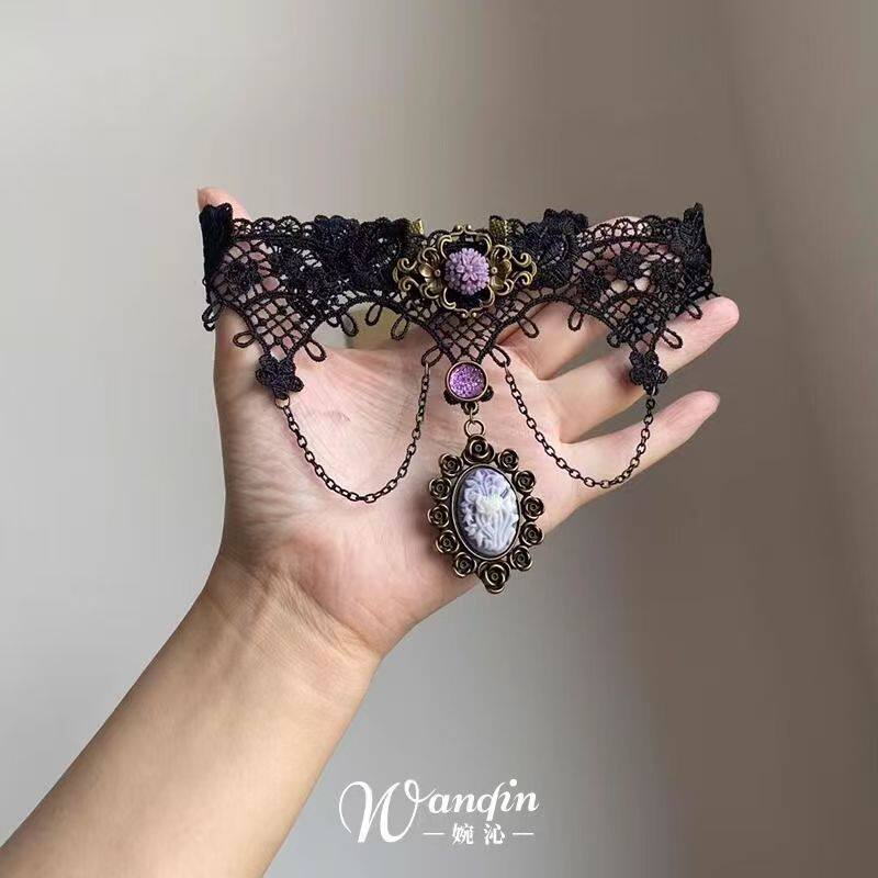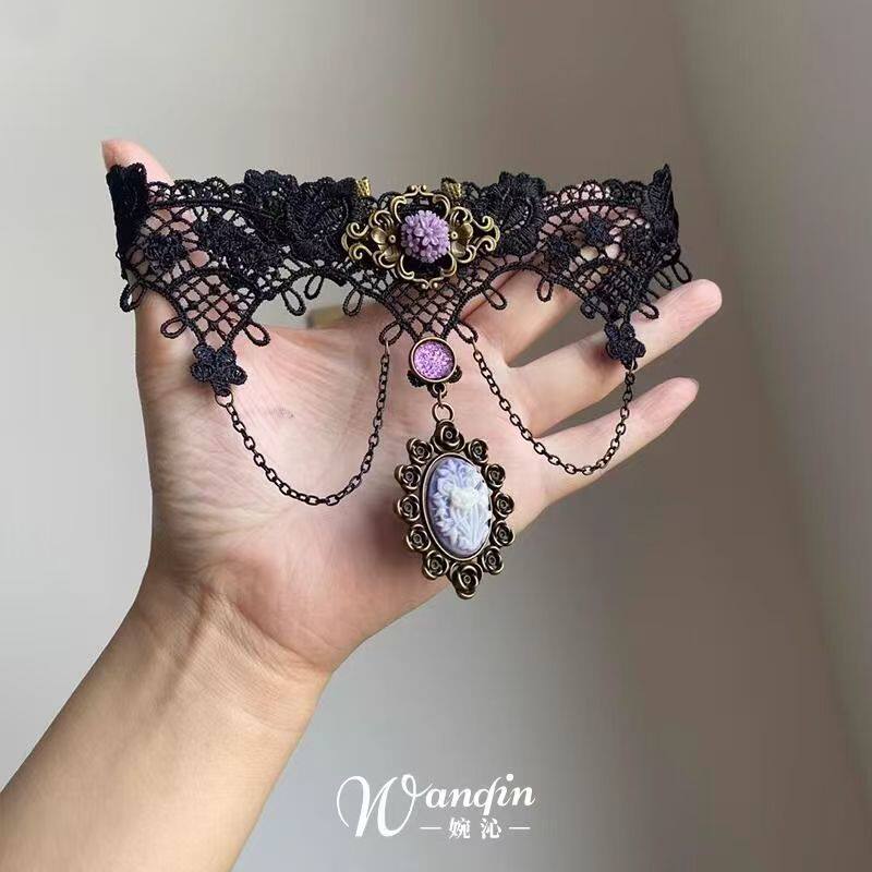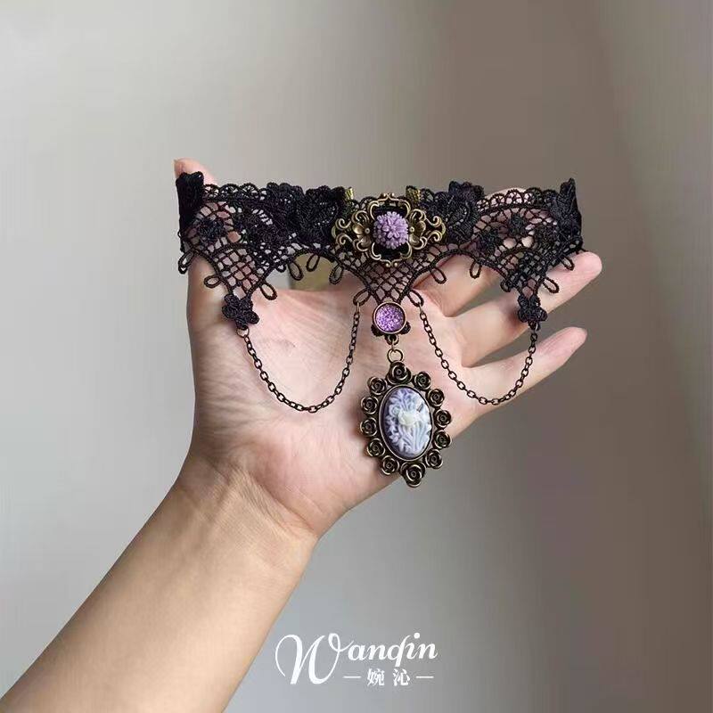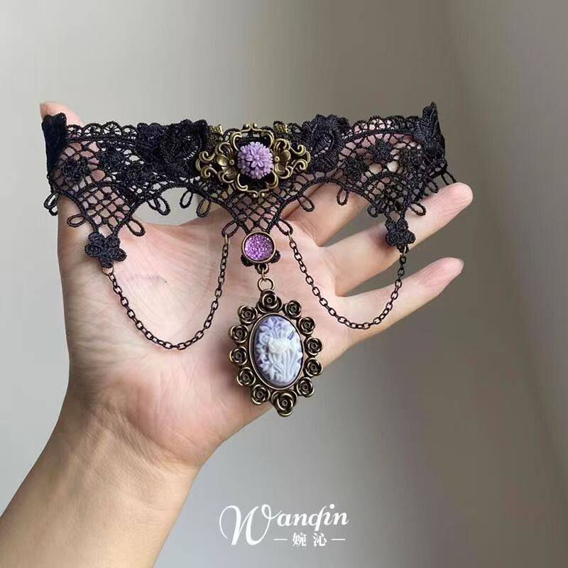 「曼陀罗」暗黑风黑色蕾丝紫色花朵项链哥特亚文化复古小众choker
