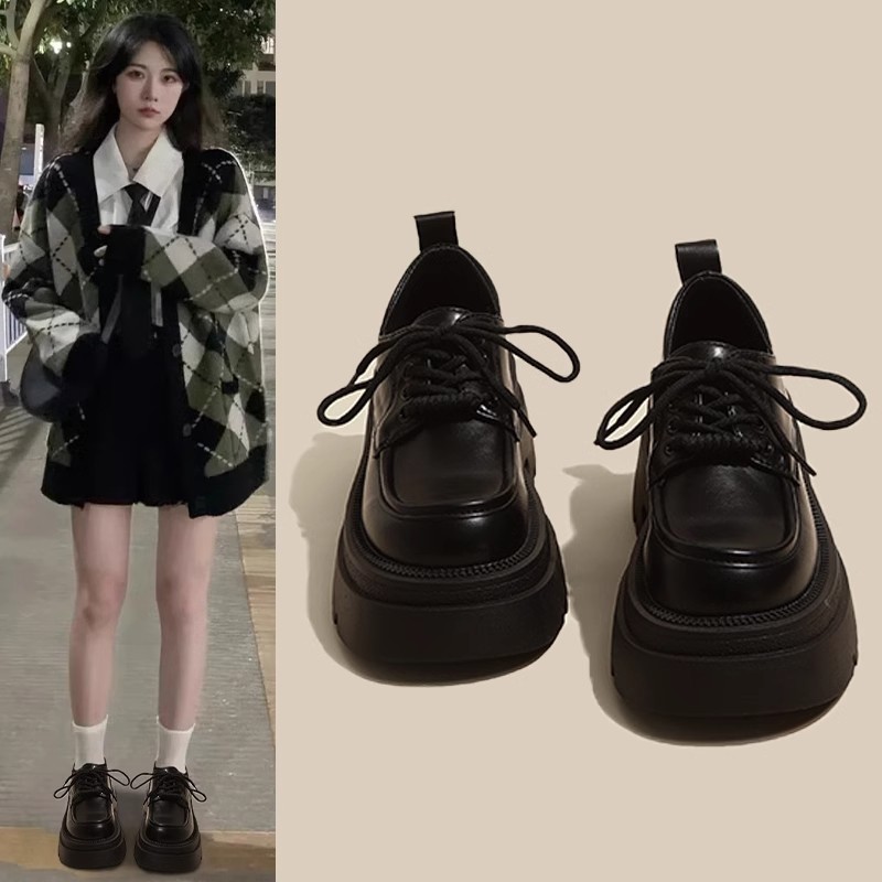 黑色圆头英伦风厚底小皮鞋女春秋2025新款复古增高单鞋子上班系带