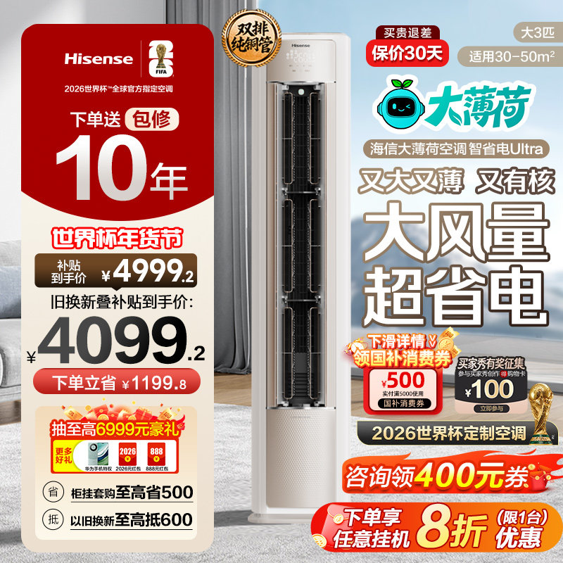 海信空调智新风X3Pro新风大3匹家用立式国补一级能效客厅柜式柜机