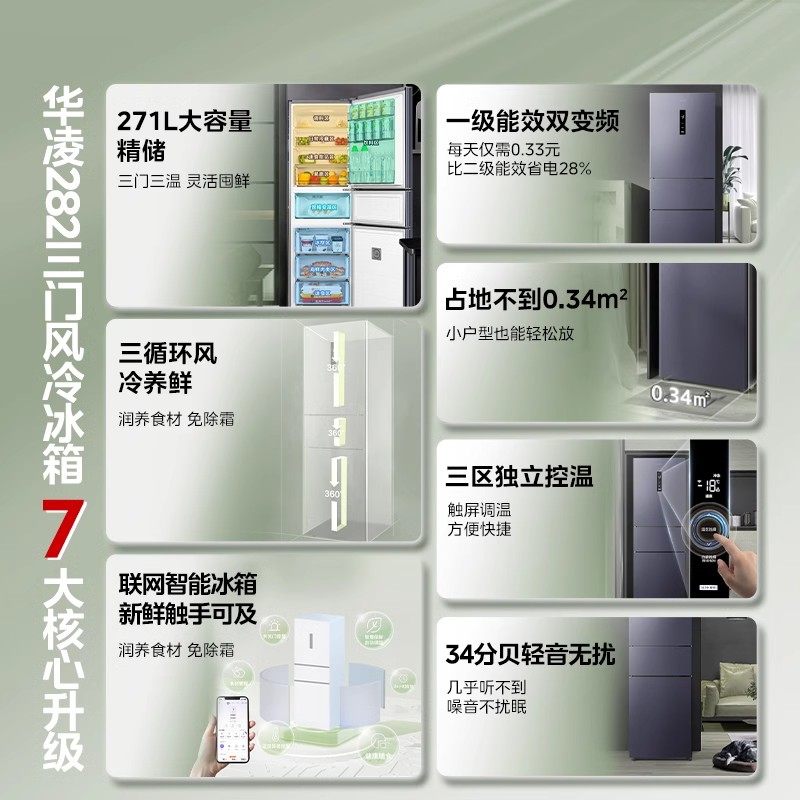 【政府补贴】华凌冰箱美的出品282三门变频一级风冷无霜租房家用