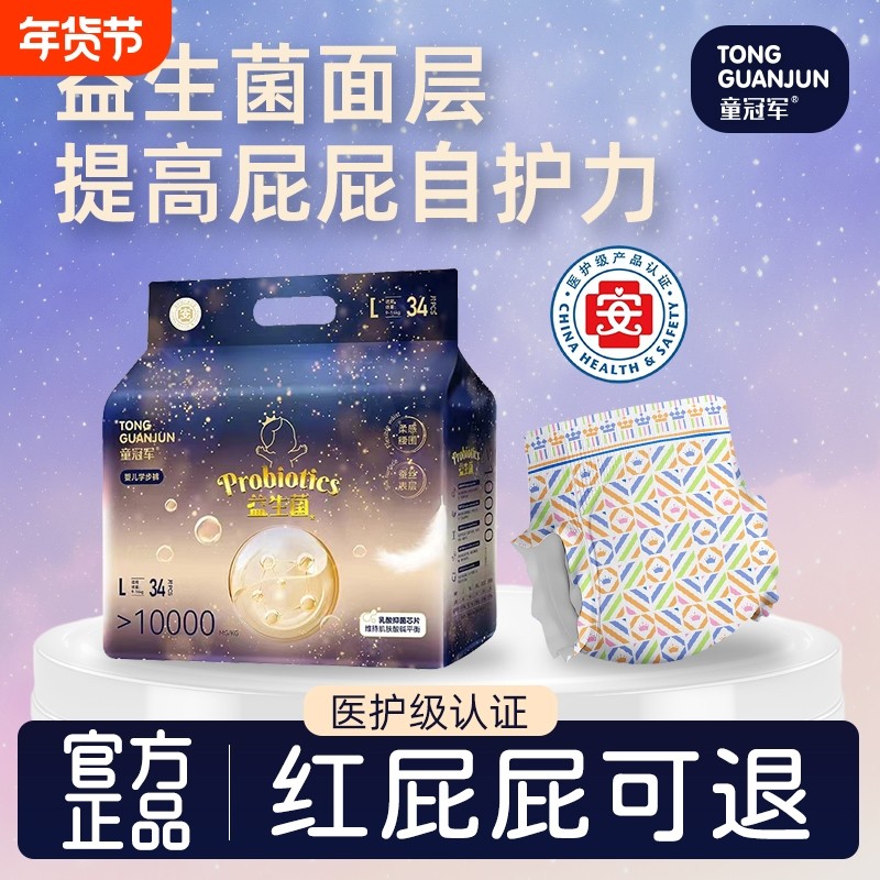童冠军益生菌尿不湿纸尿裤新生婴儿拉拉裤秋冬夜用舒适透气S-4XL