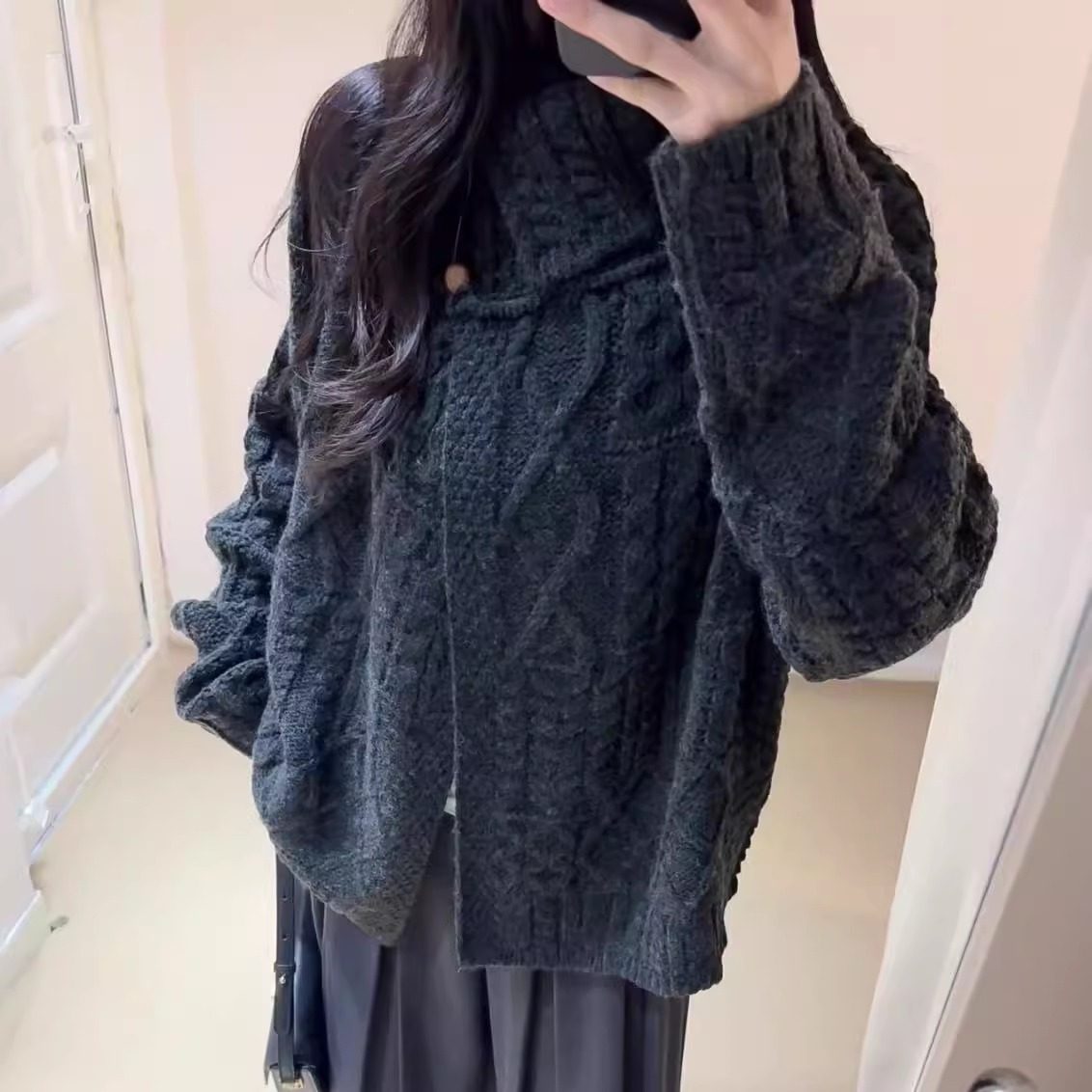 oversize!大翻领麻花单排扣毛衣开衫女秋冬新款韩版宽松针织上衣