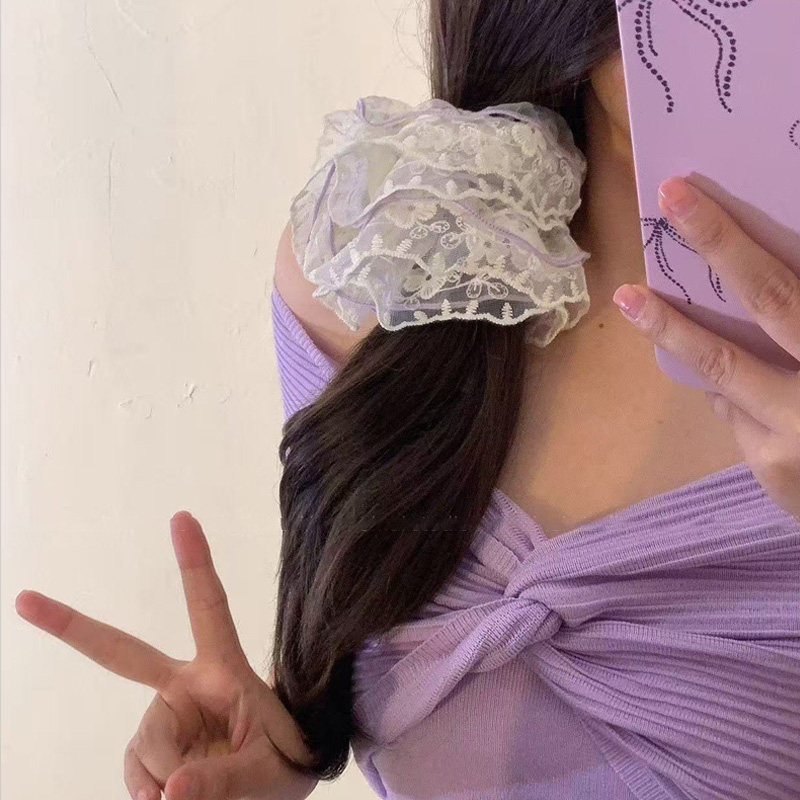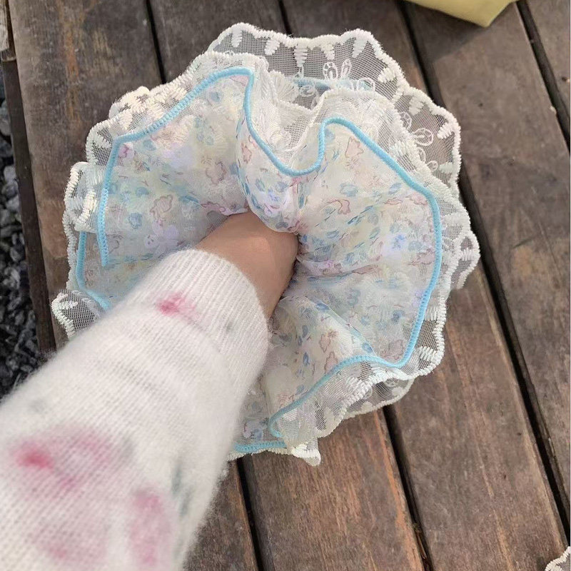 紫色碎花大肠发圈~蕾丝花边4层气质大号丸子头发绳女蓝色甜美短发