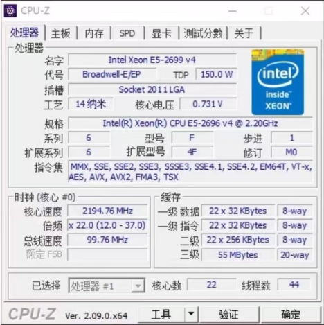 Intel E5-2696V4 CPU 22核44线程 2.2G 2017年支持X99 DDR3/DDR4