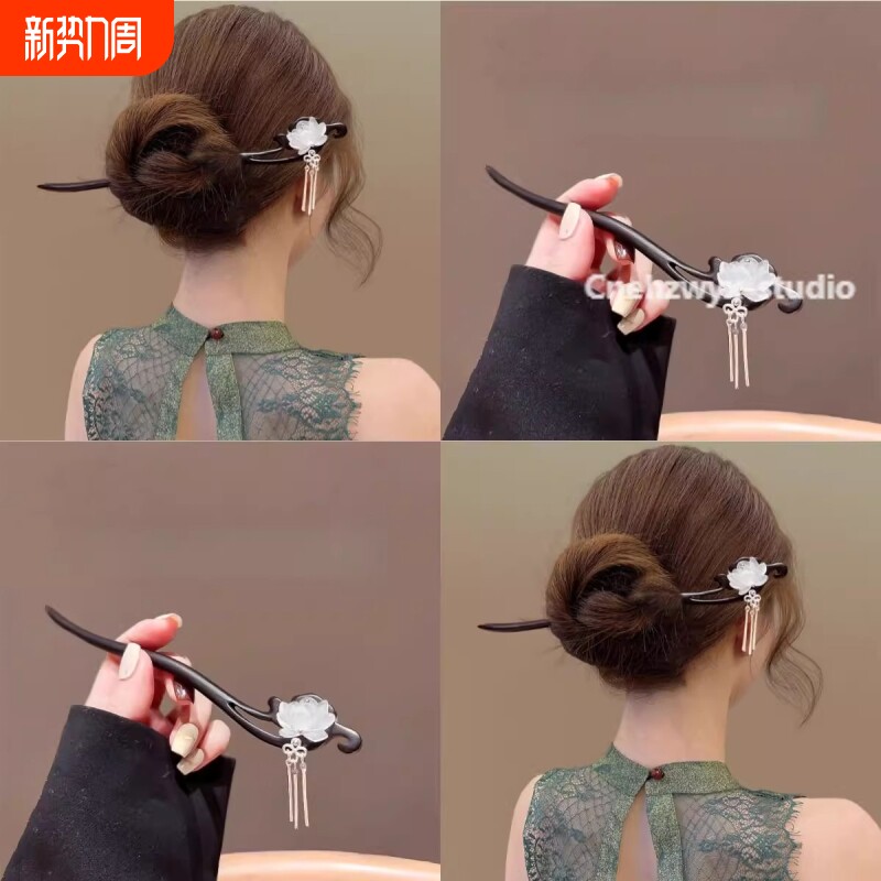 中式莲花檀木发簪女古风步摇流苏盘发簪子日常高级感发钗配饰双面