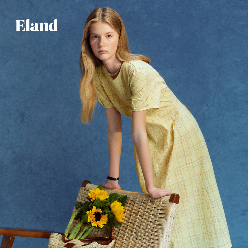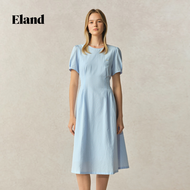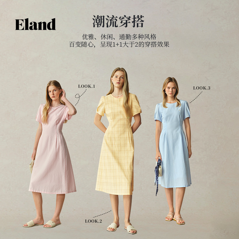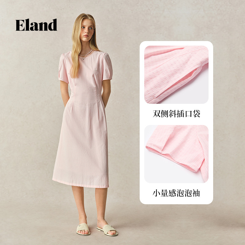 【柔光裙】Eland衣恋连衣裙女甜美a字泡泡袖圆领裙子2025夏季新款
