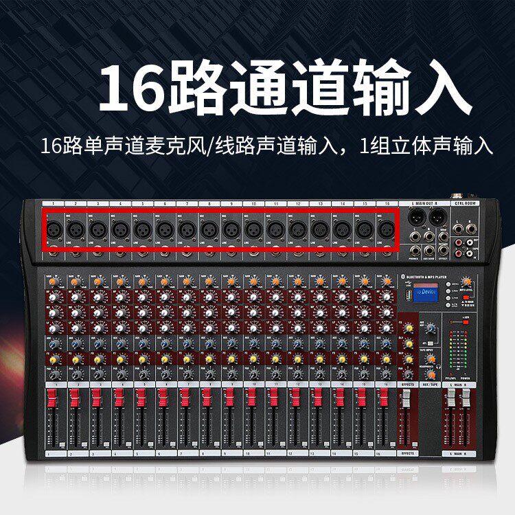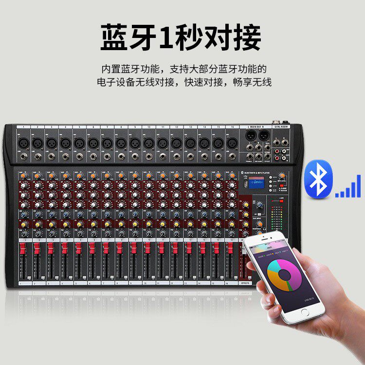 灰色16路调音台小型混响效果器 K歌直播带蓝牙幻象供电调音台
