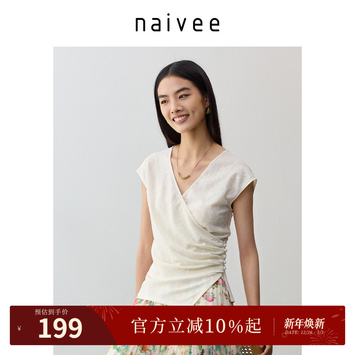 naivee纳薇巨好看设计感上衣法式收腰显瘦V领短袖女t恤2025新款