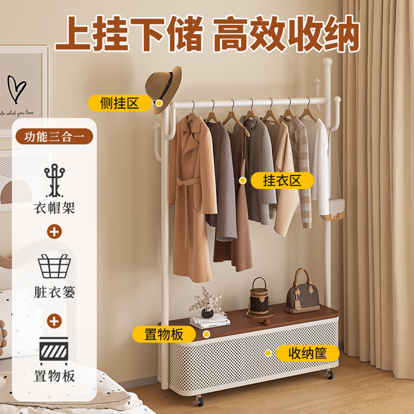 实木可移动衣帽架落地挂衣架卧室角落不占空间脏衣篓小型立式衣架