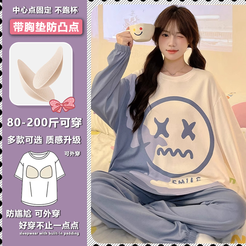 胖mm女款睡衣春秋季大码200斤带胸垫可外穿长袖防凸点卡通家居服