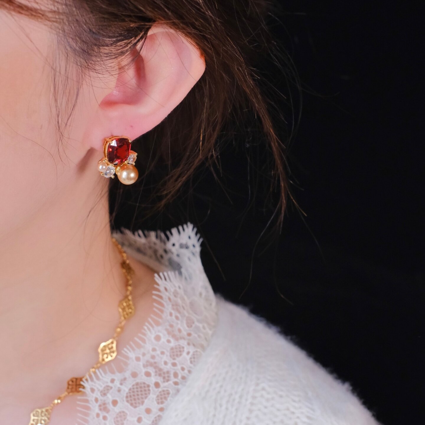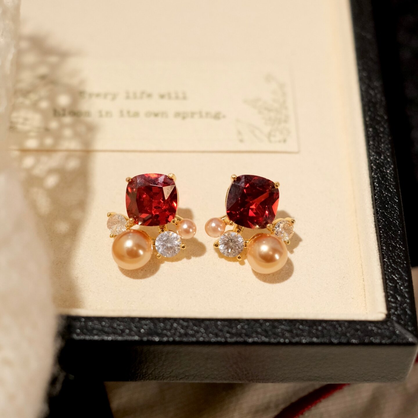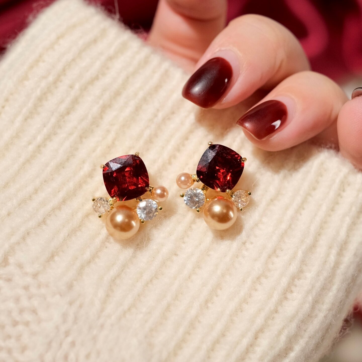 《热红酒》复古秋冬优雅轻奢圣诞酒红色方糖珍珠耳钉耳环耳夹耳饰