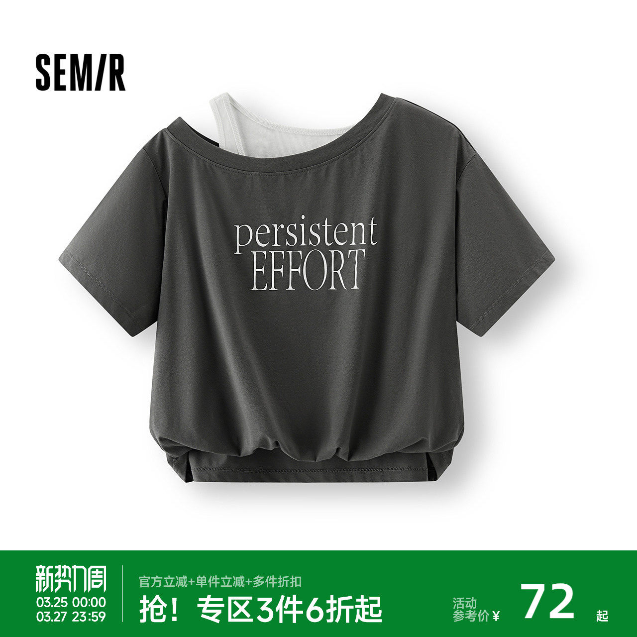 森马短袖T恤女夏短款花苞oversize字母假两件斜肩辣妹设计感衣服
