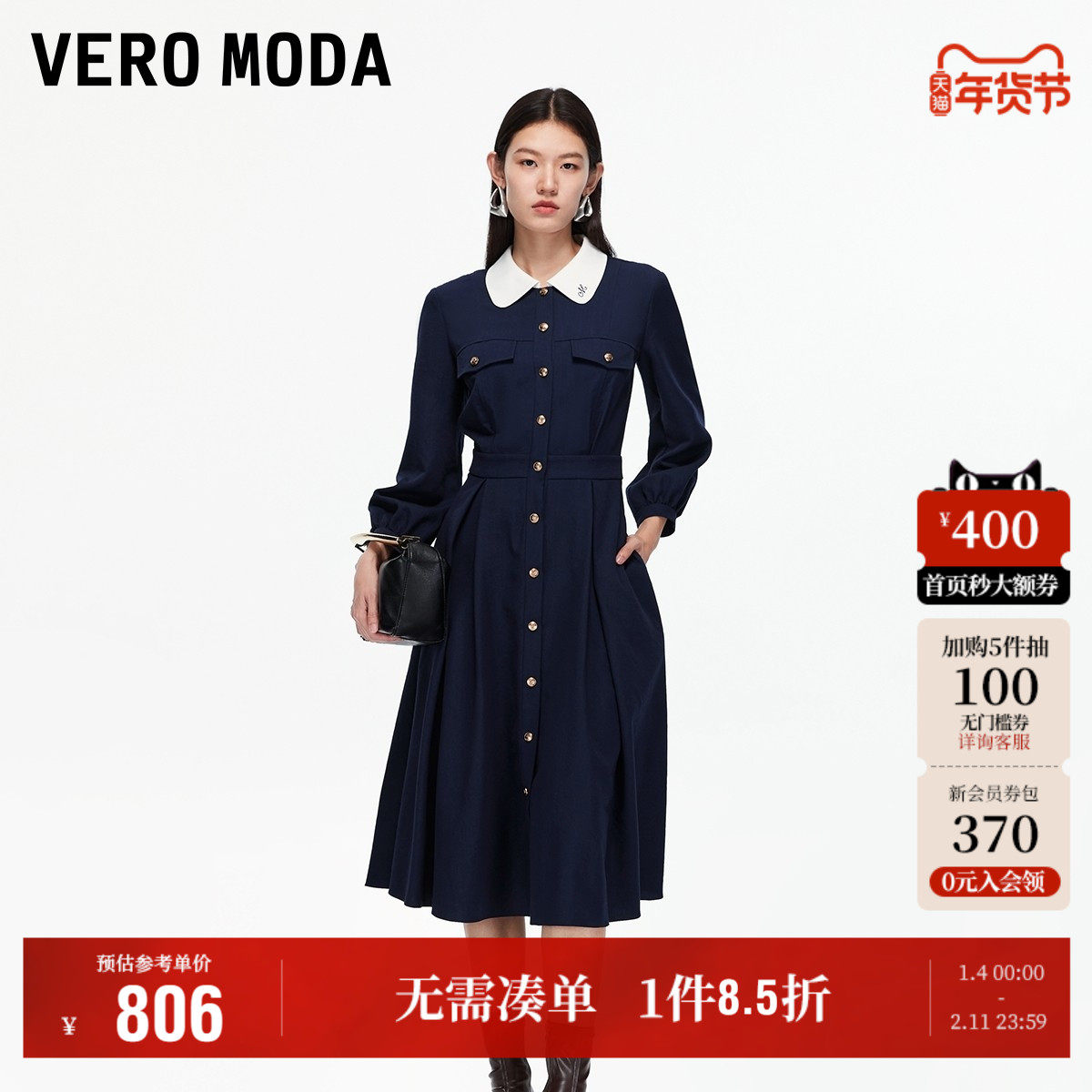 Vero Moda奥莱连衣裙女2025秋冬新款撞色翻领高腰收褶中长裙百搭