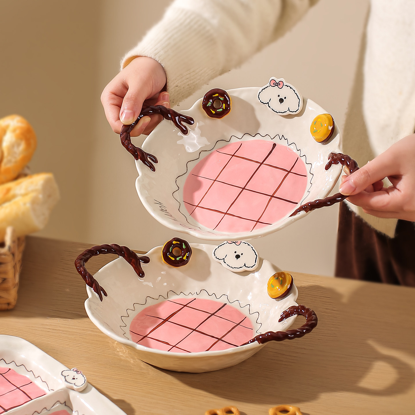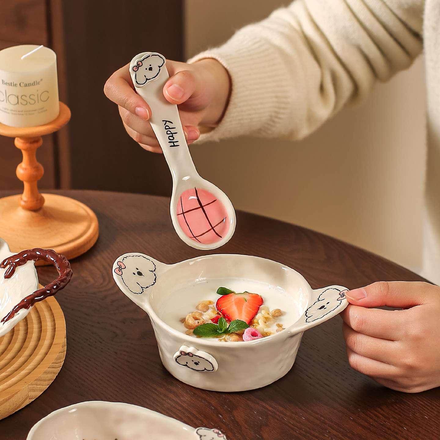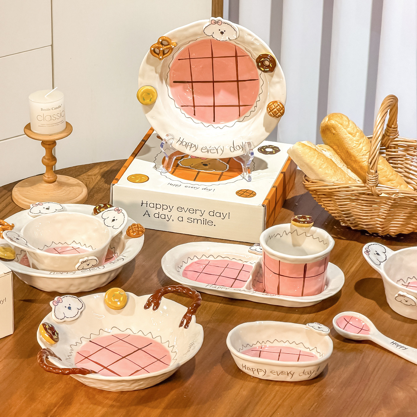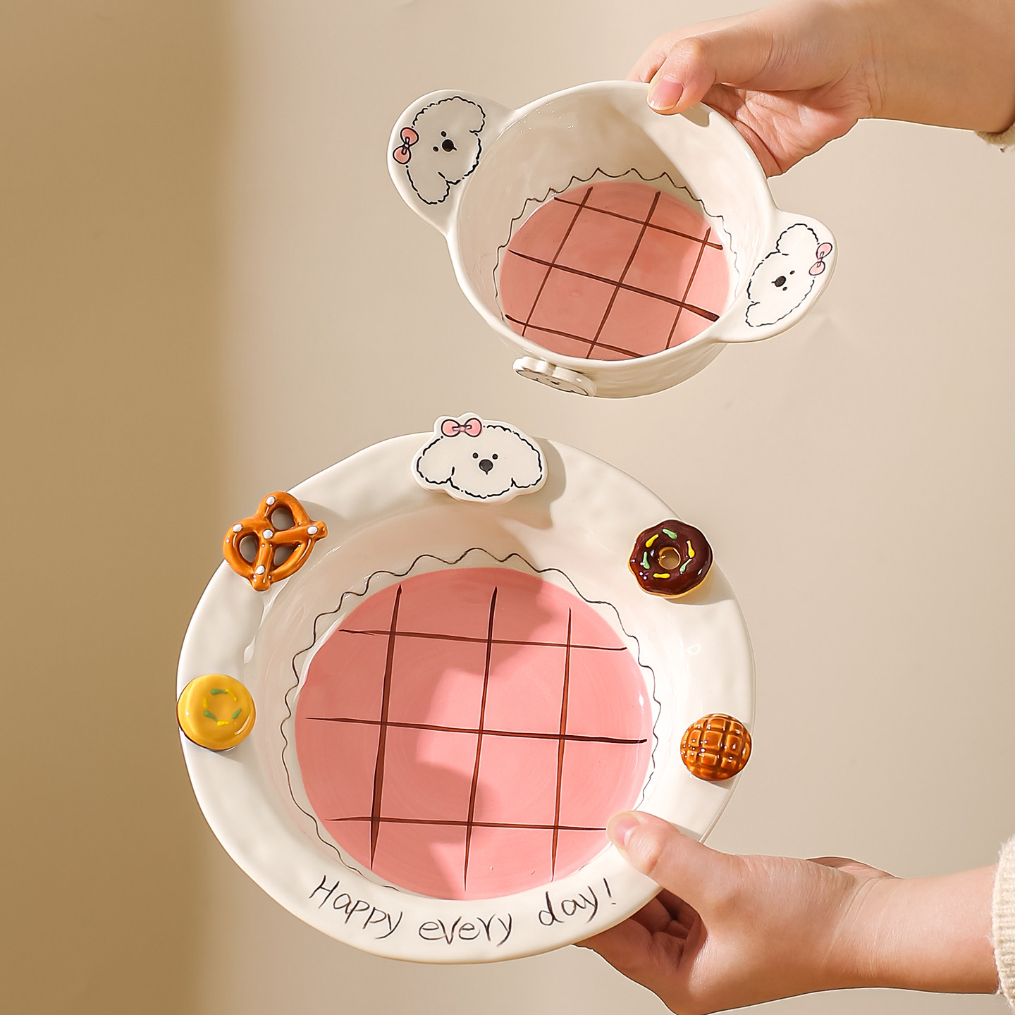 奶油风陶瓷碗家用卡通菜盘子可爱米饭碗汤碗釉下彩儿童餐具耐高温