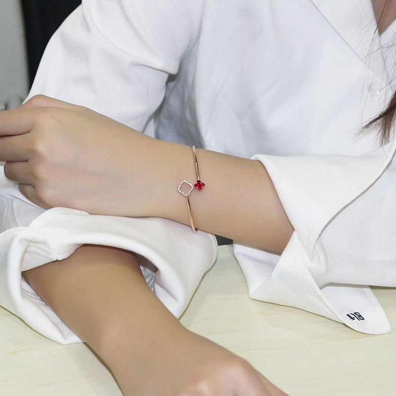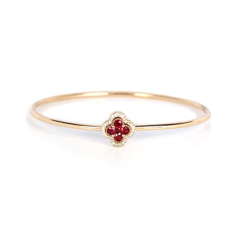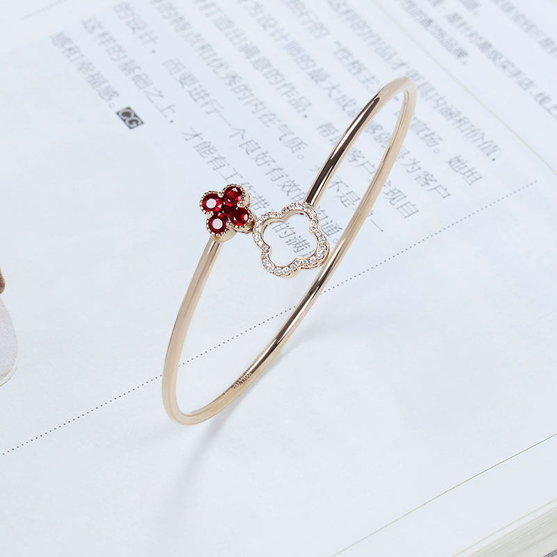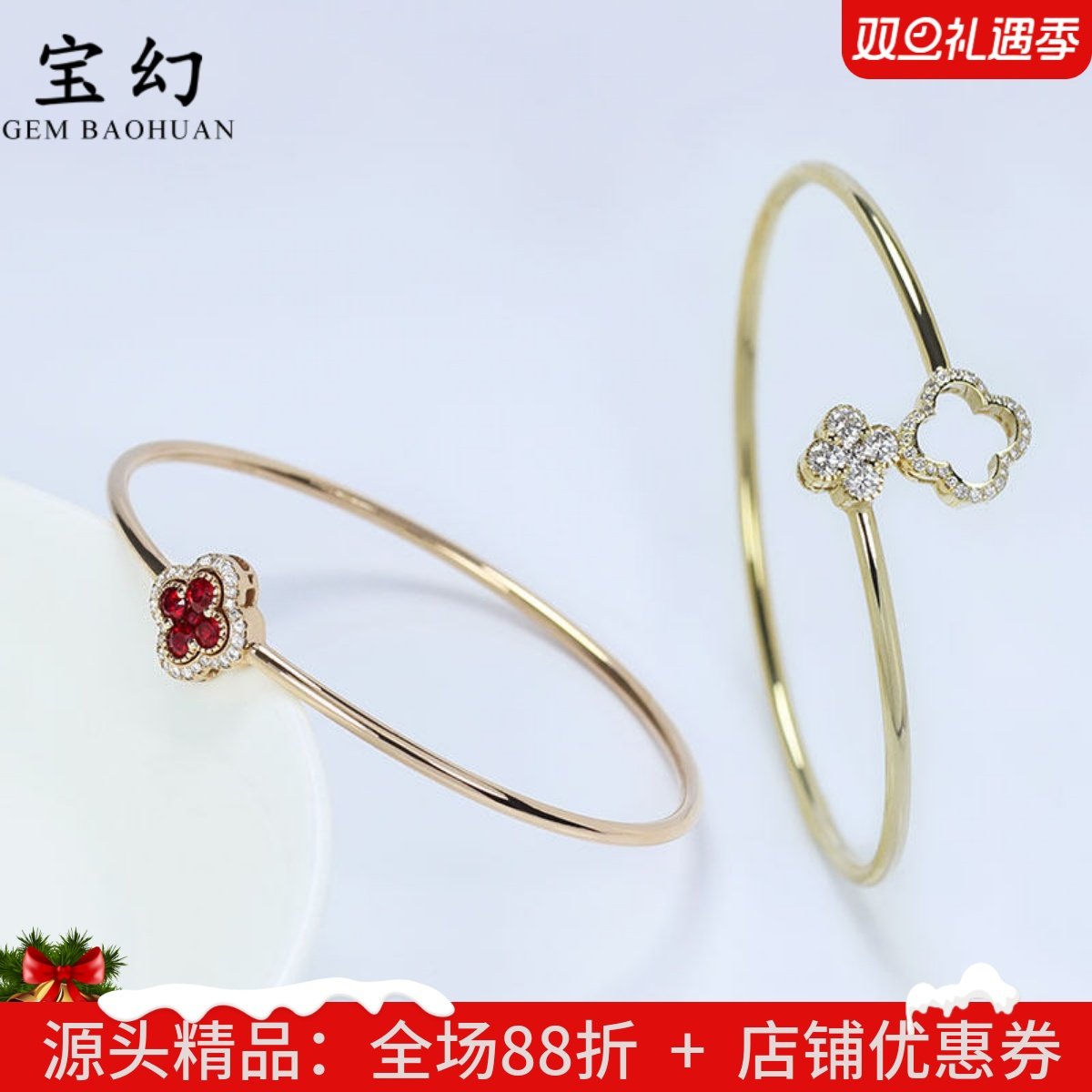 18K玫瑰金天然鸽血红宝石幸运四叶草弹力手镯 钻石弹性活口彩金女