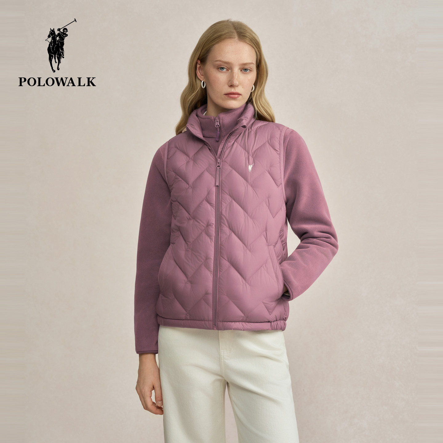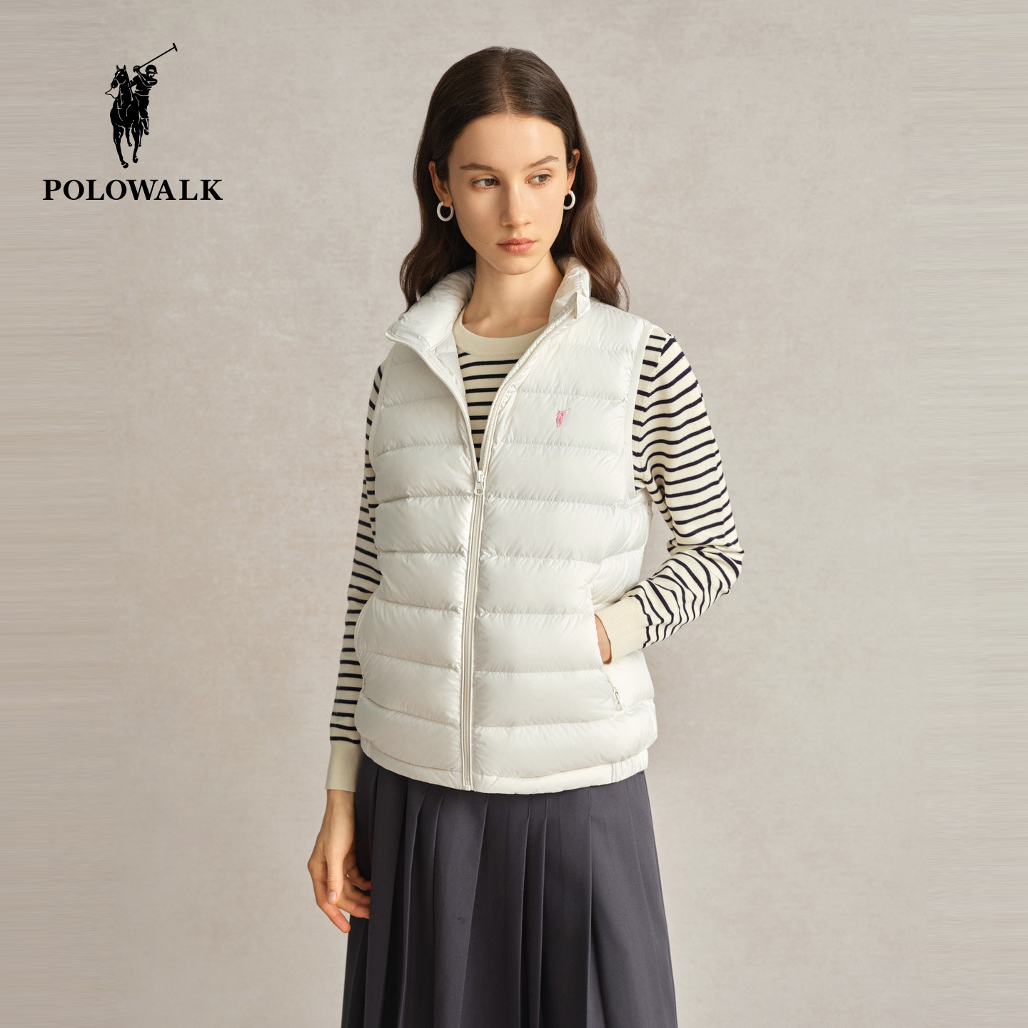 POLOWALK女士排骨羽绒马甲背心秋冬90鸭绒立领纯色保暖百搭外套