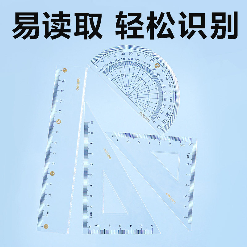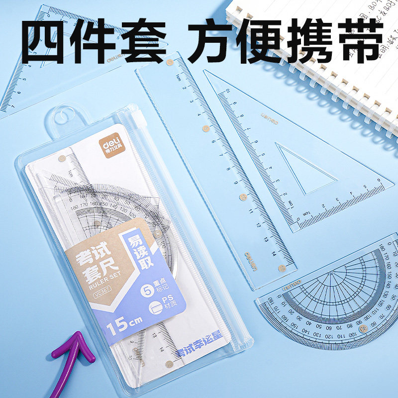得力考试套尺尺子套装三角尺几何多规格中小学生亚克力套尺考试推荐四件套学生用绘图15cm20cm透明套尺不费眼
