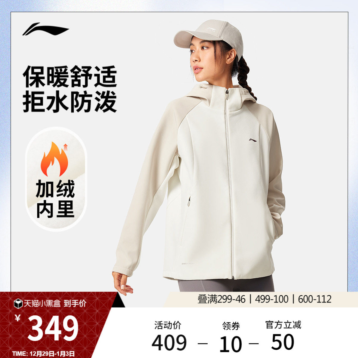 李宁风衣女新款健身系列连帽防风服冬季加绒保暖梭织夹克运动外套