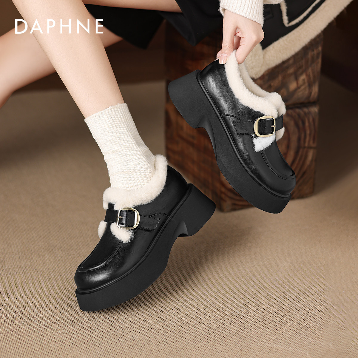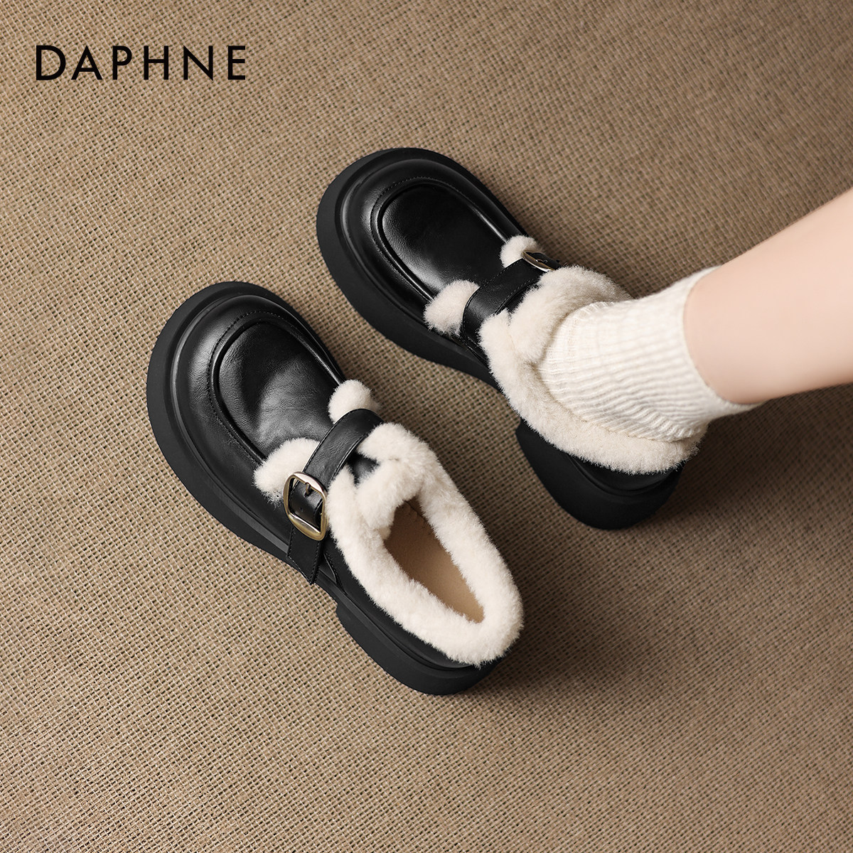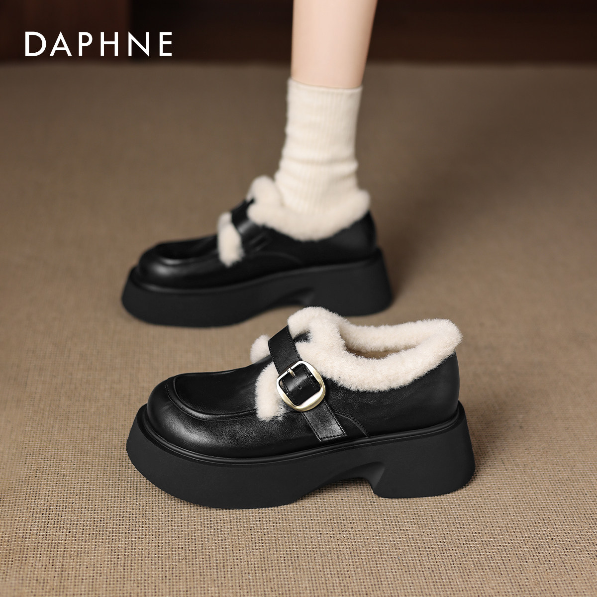 达芙妮厚底雪地靴女2026新款冬季乐福鞋保暖单鞋加绒小皮鞋毛毛鞋