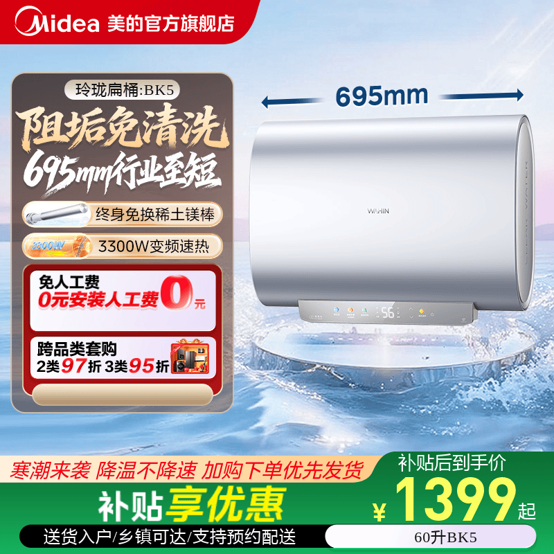美的出品华凌一级扁桶电热水器BK5洗澡家用卫生间官方旗舰UDmini