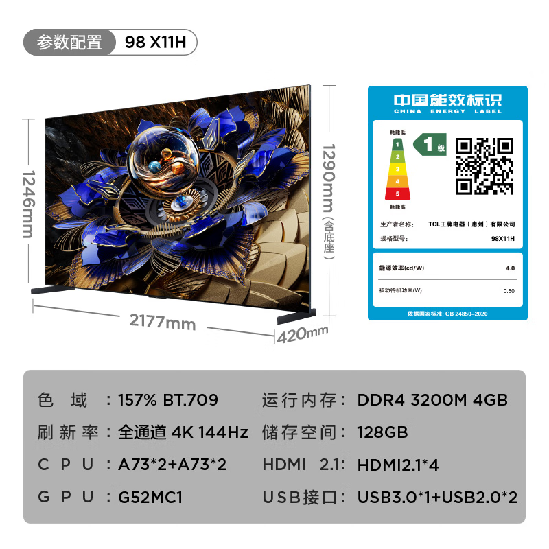 TCL 85X11H 85英寸 4K超高清QD-Mini LED领曜大屏智能电视98X11H