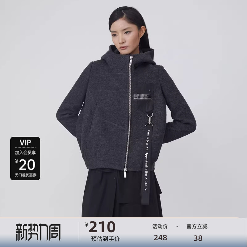 sdeer圣迪奥女装高领连帽字母织带不规则毛呢外套S214Z2209