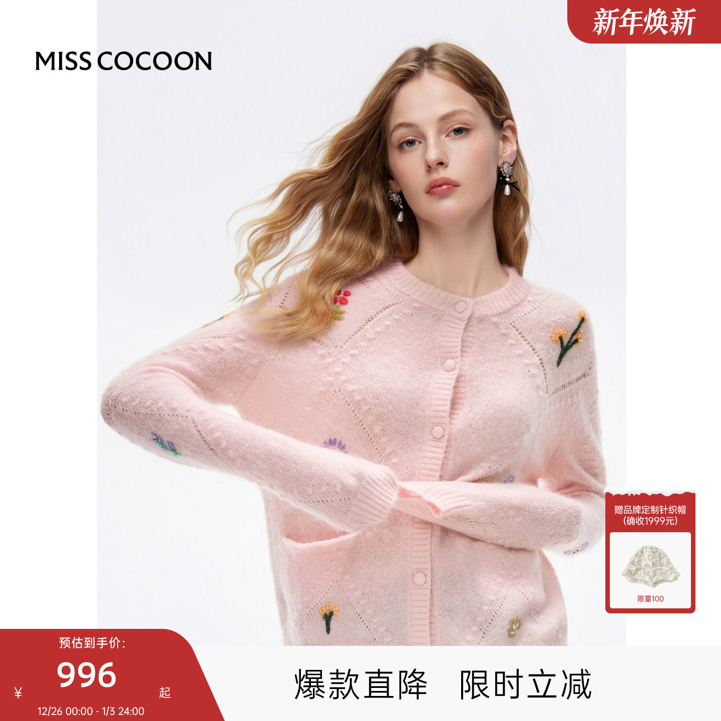 MISSCOCOON可可尼马海毛粉色开衫女2025冬季新款刺绣绵羊毛针织衫