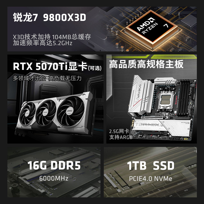AMD锐龙R5 9600X/9700X/9800X3D/5060TI 16G/5060 8G台式电脑N卡游戏电竞主机DIY组装机吃鸡永劫悟空CSGO整机