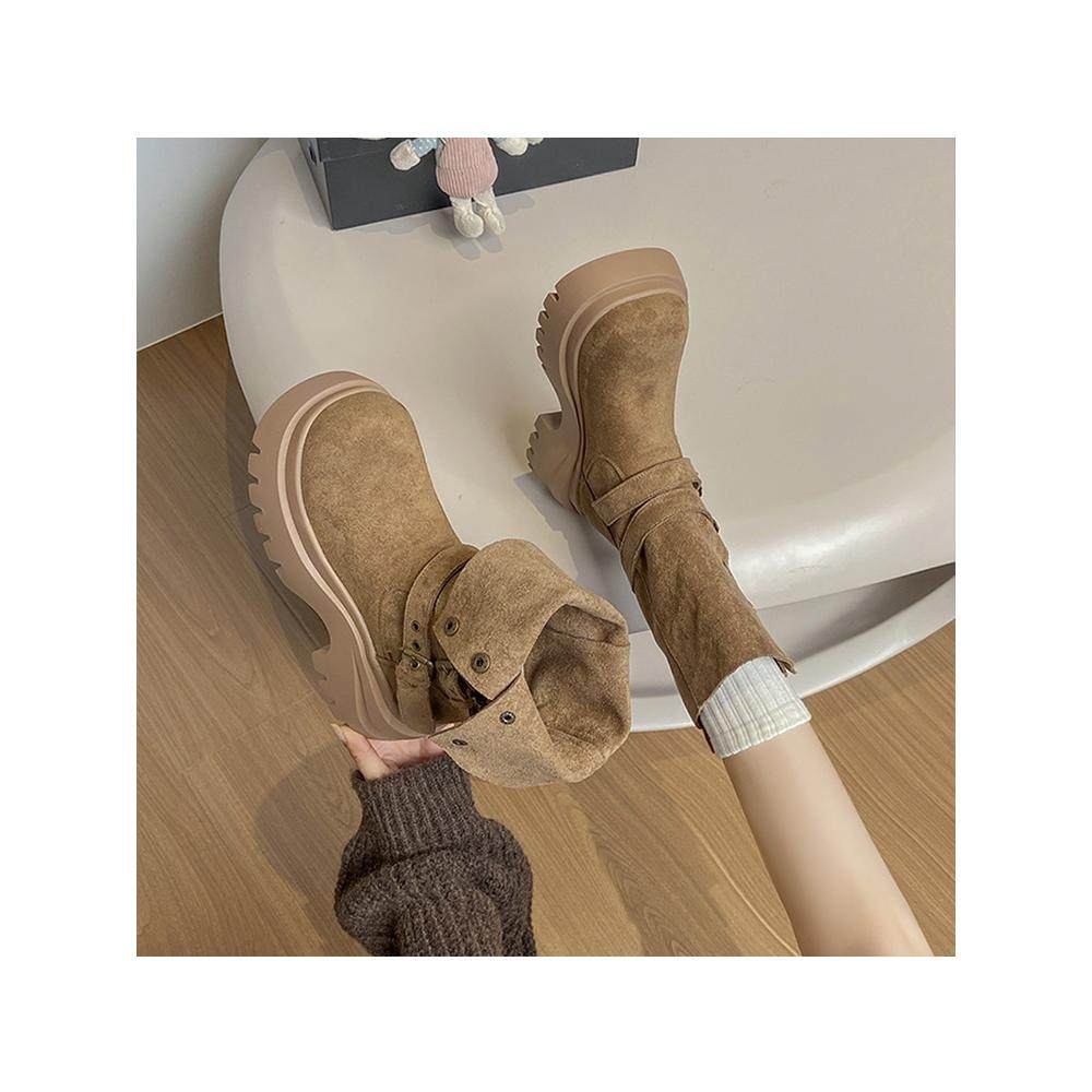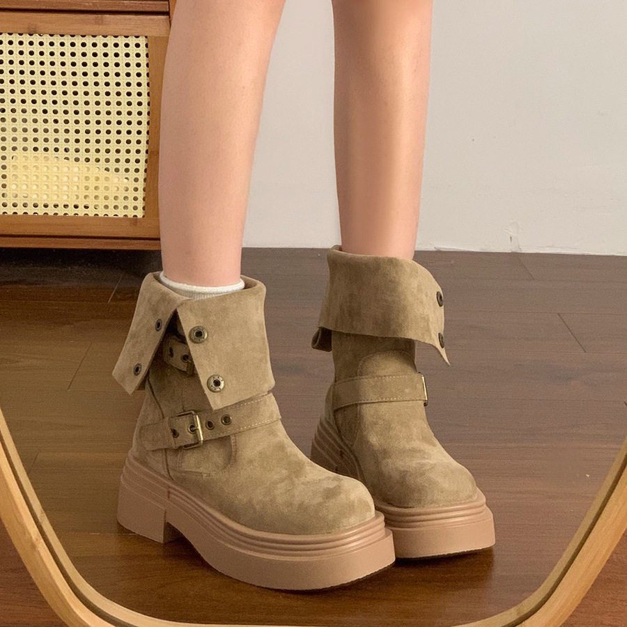 张元英同款皮带扣堆堆靴粗跟复古做旧中筒靴韩版靴子小众工装靴女