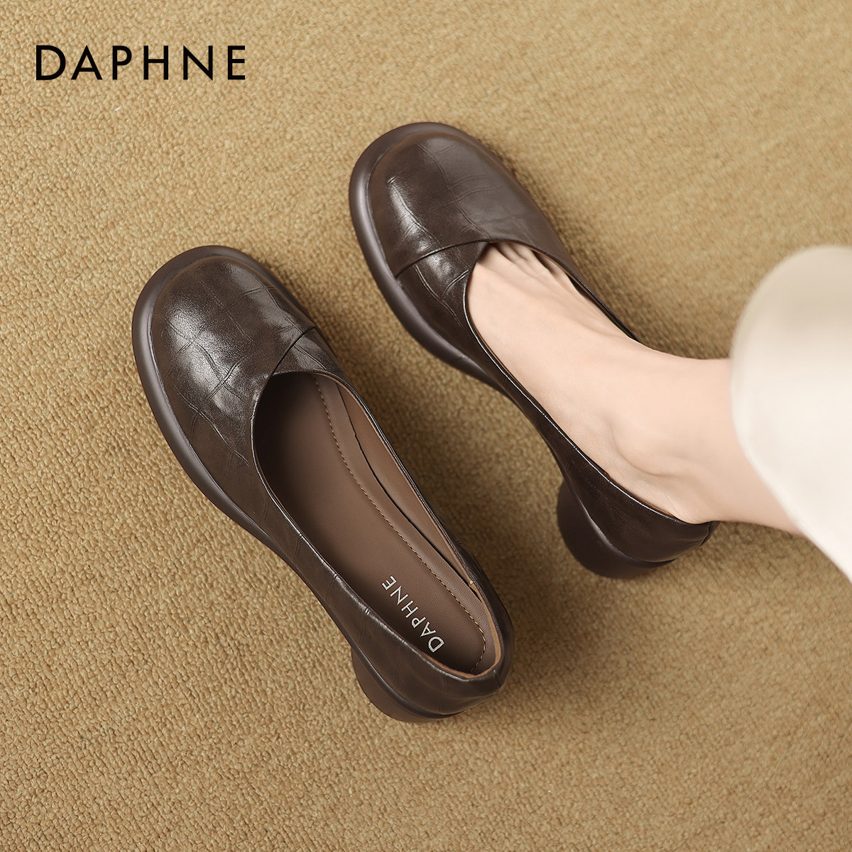 达芙妮浅口单鞋女2026新款夏季粗跟皮鞋法式中跟厚底舒适小皮鞋女