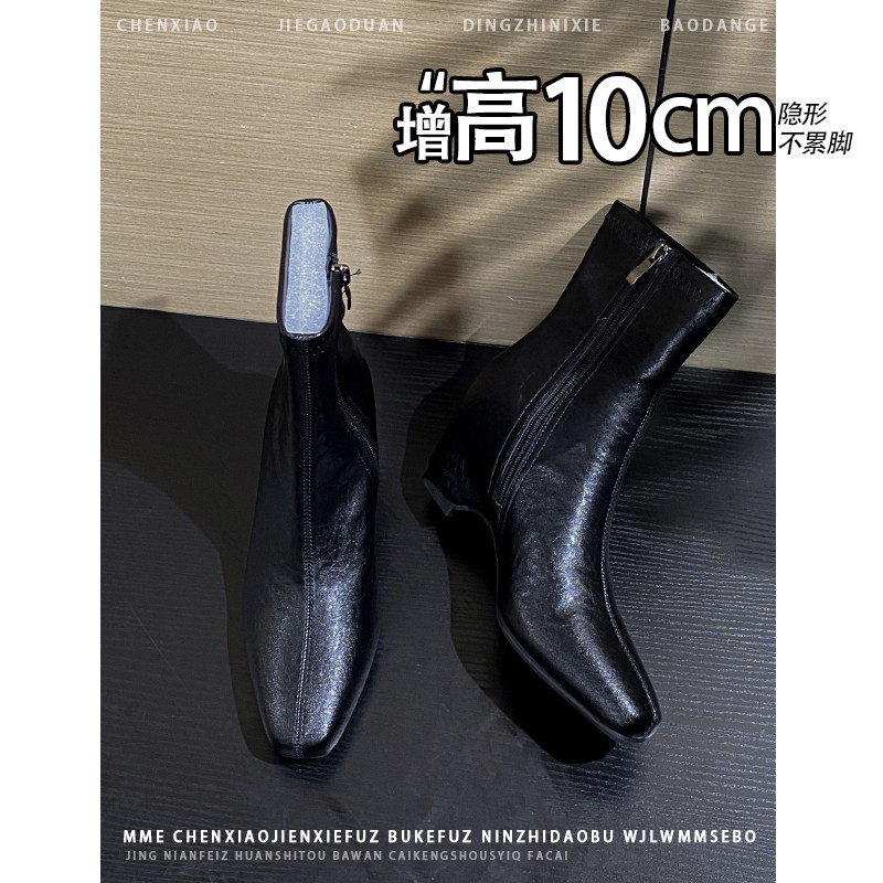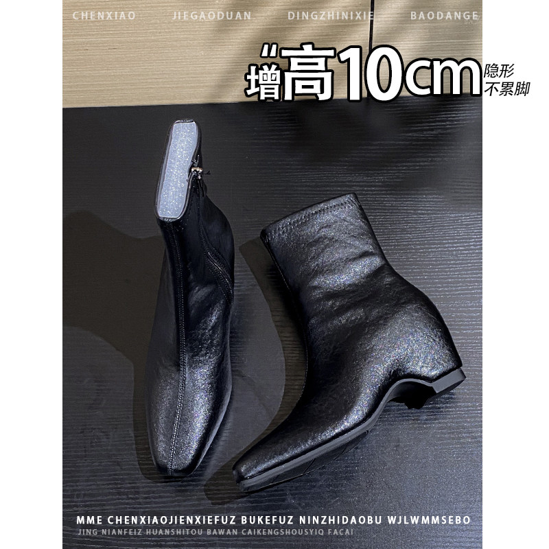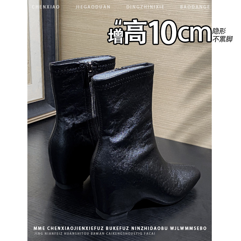 不累脚!内增高10CM法式方头亮面靴子女2025冬季新款侧拉链中筒靴