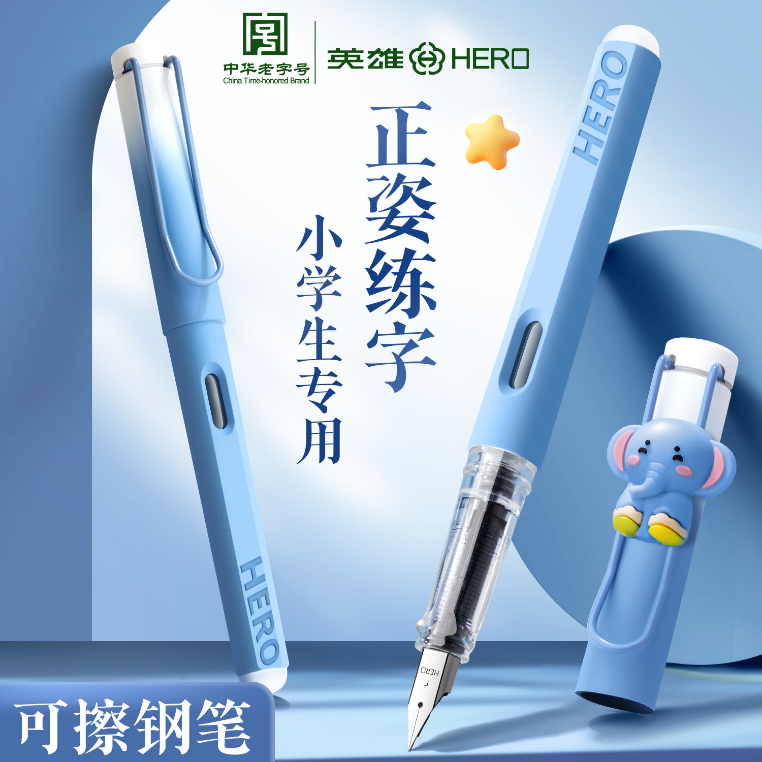 2024新品英雄牌钢笔热敏可擦钢笔小学生专用三年级练字橡皮擦小暗尖0.38可擦魔力擦晶蓝色墨蓝儿童男孩女孩