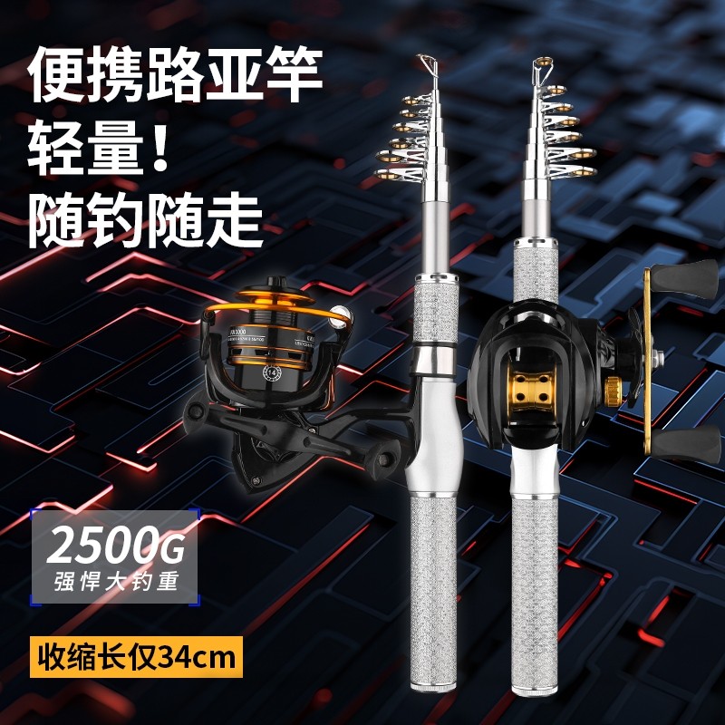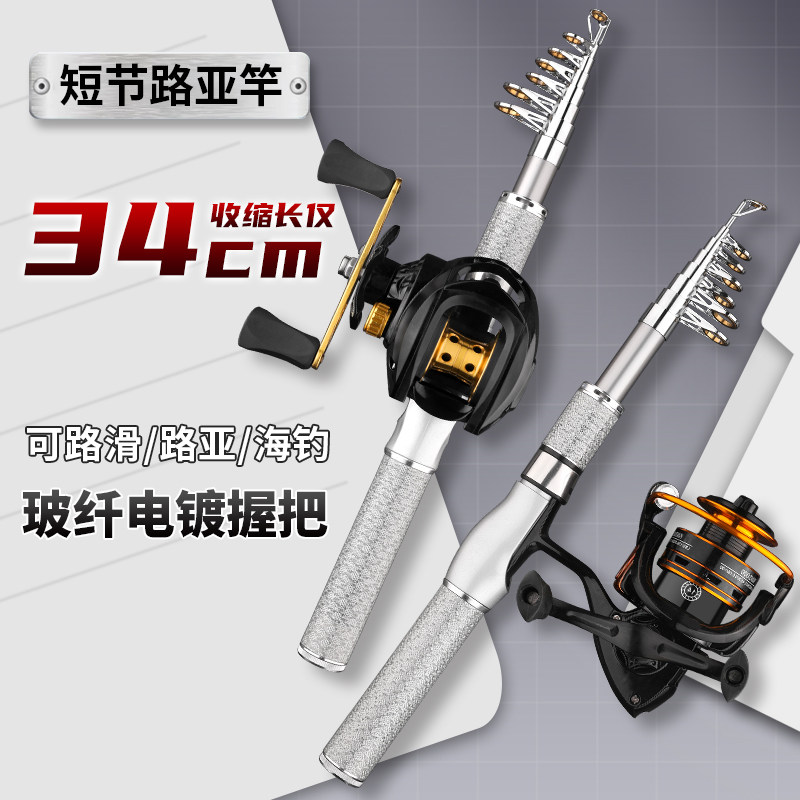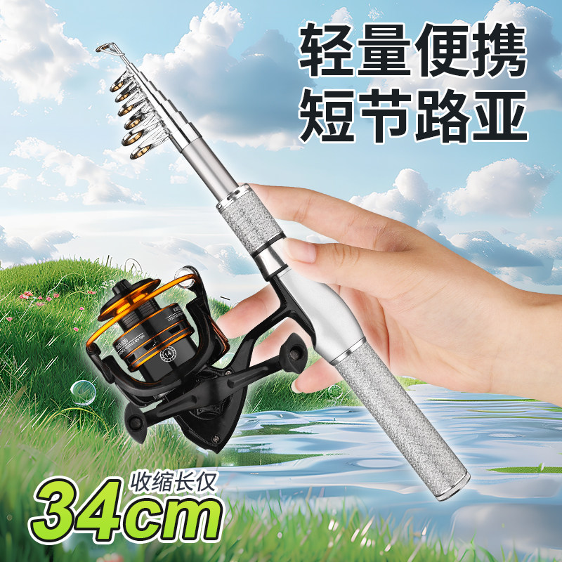 迷你短节银白小路亚竿伸缩便携式套装超轻远投路亚竿抛竿34CM超硬