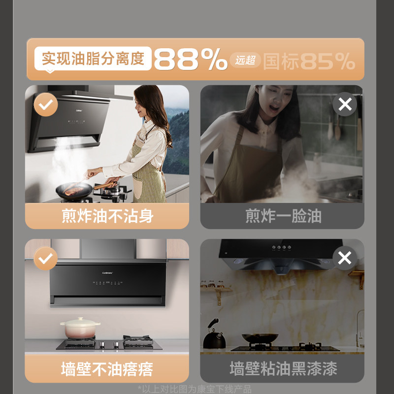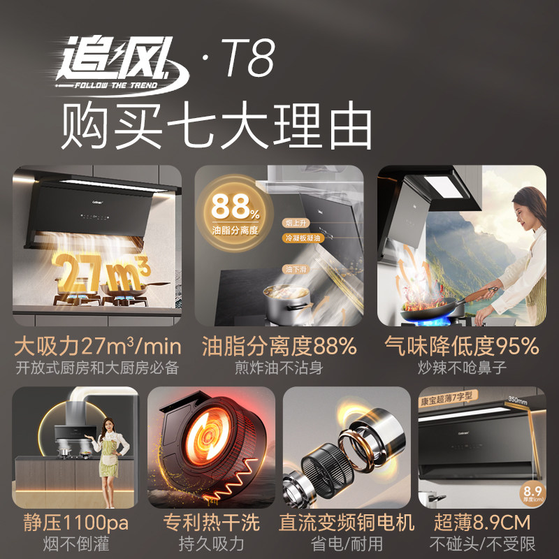 康宝T8家用抽油烟机挂式低噪音变频高效节能7字吸油烟机智能清洗