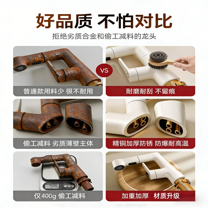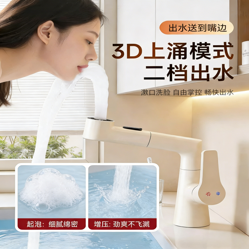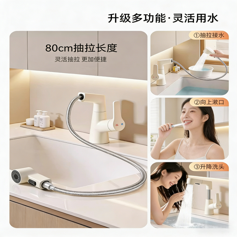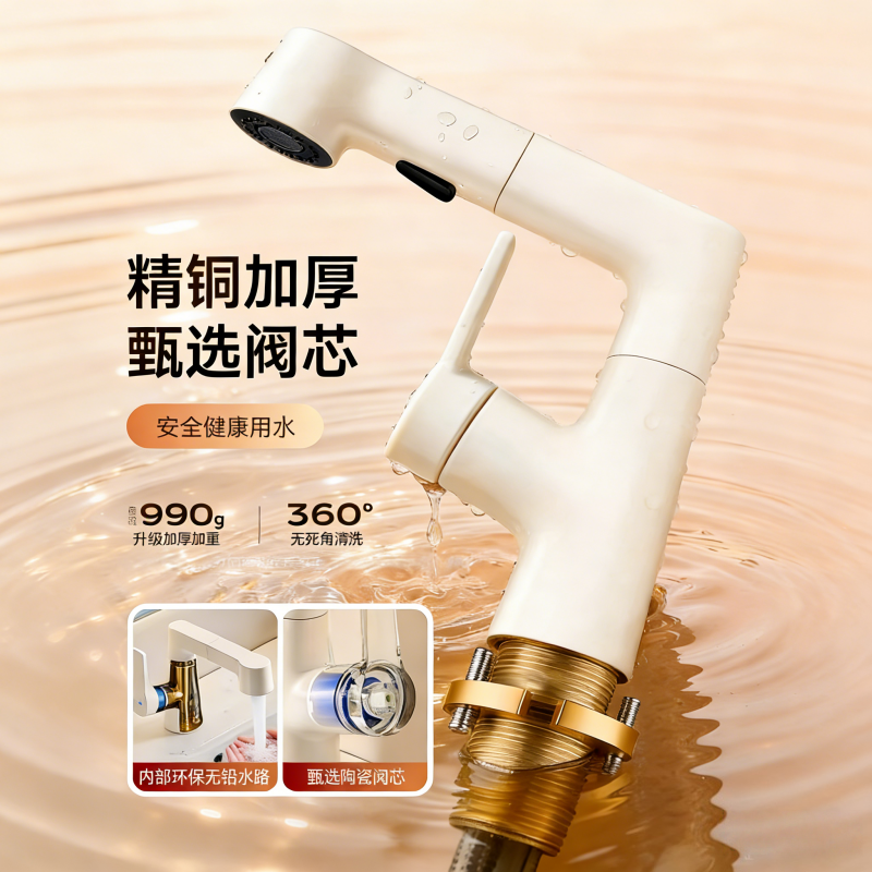新款奶油风白色精铜洗脸盆抽拉式水龙头冷热两用洗漱台面盆浴室柜