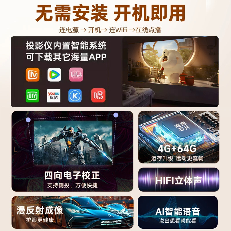 2026新款投影仪家用超高清小型宿舍学生无线手机便携式卧室出租屋投墙4K电视无需幕布投影机