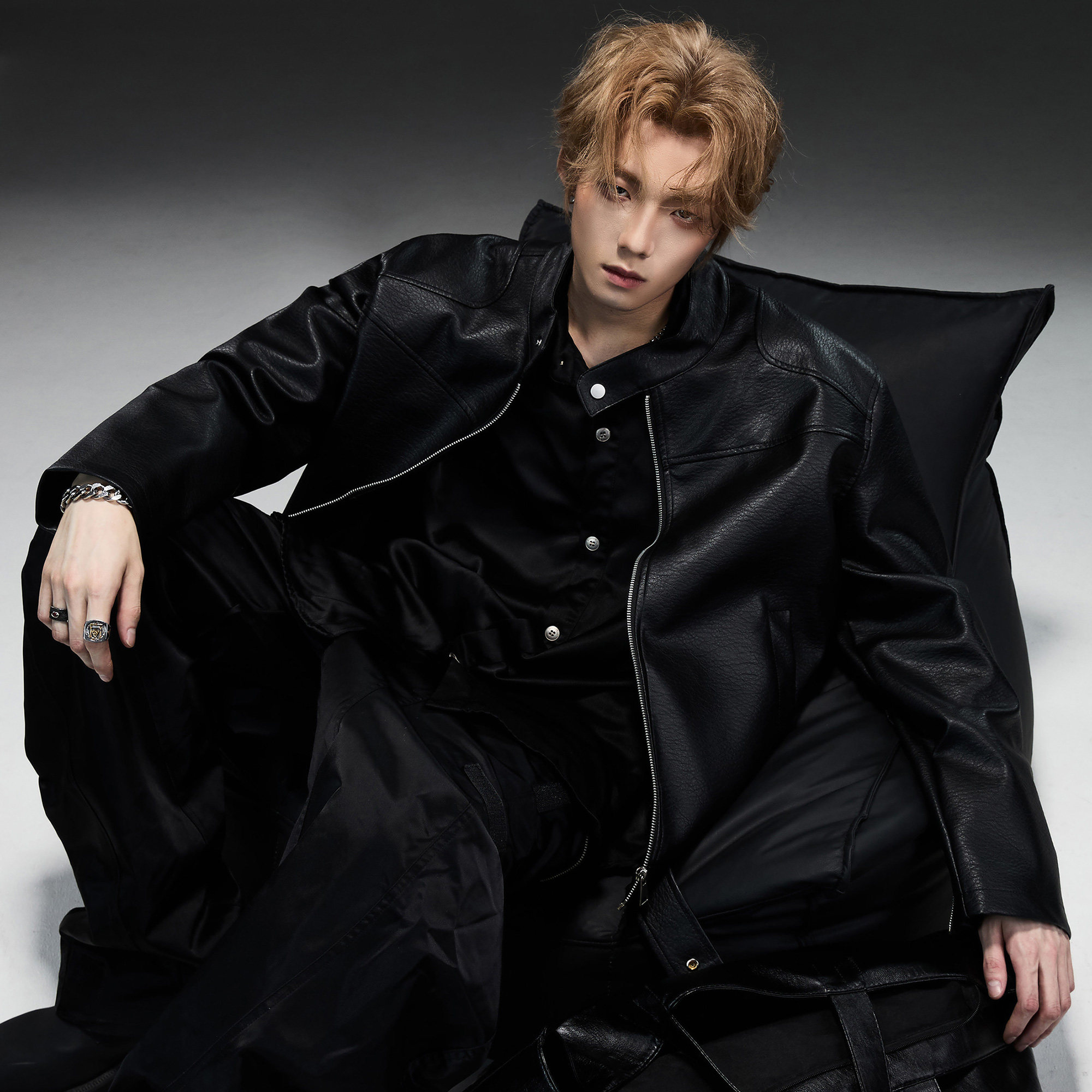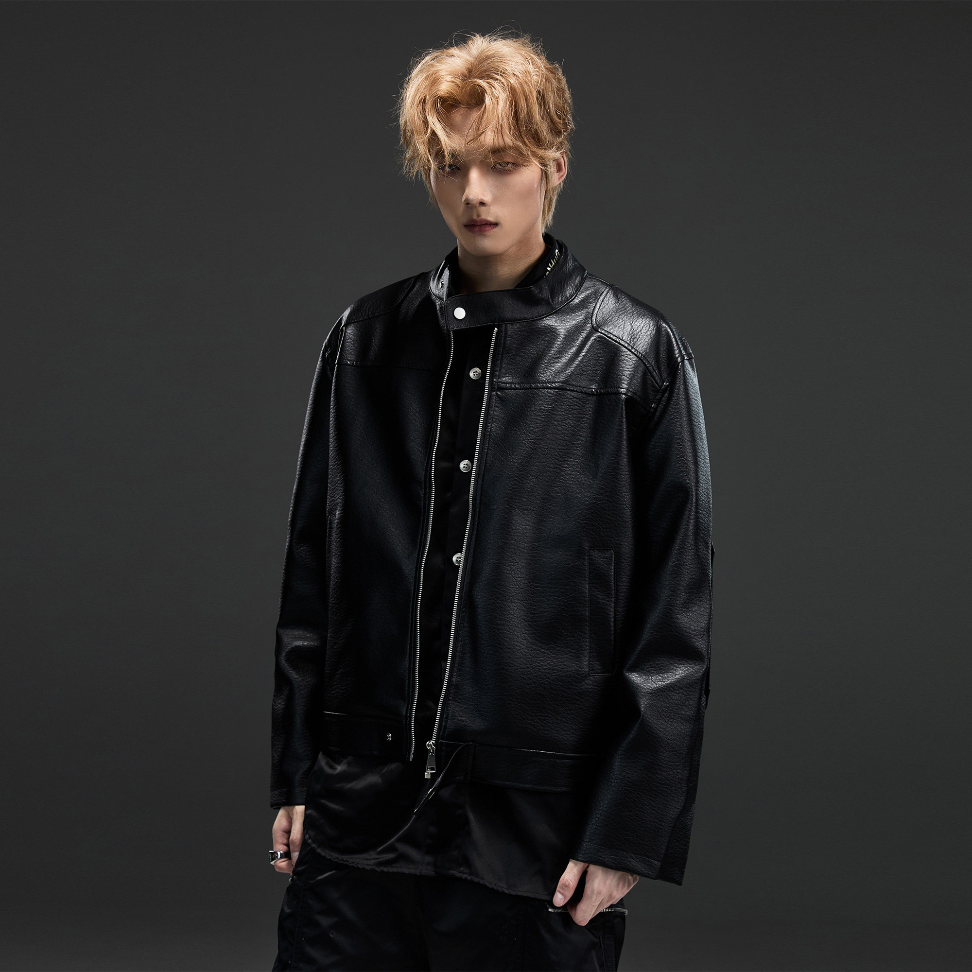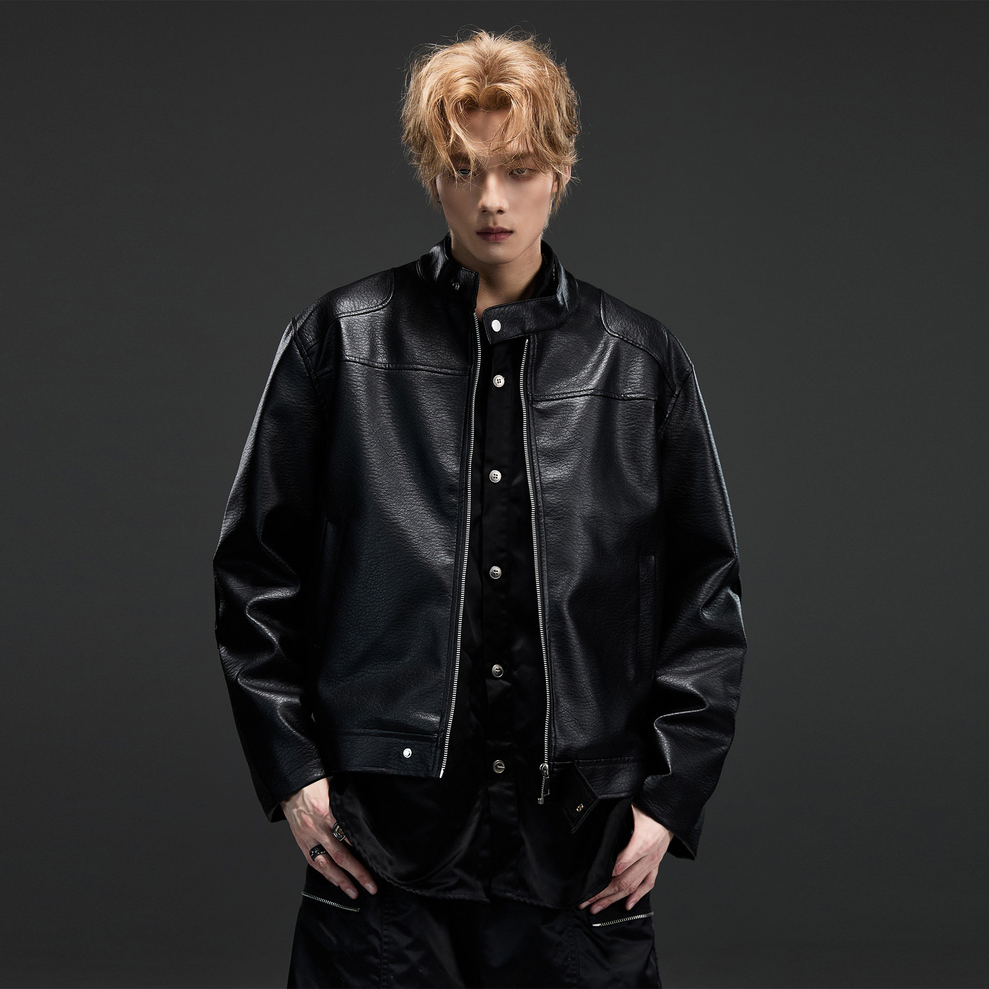 ALLIN 美式短款机车皮衣男春秋潮牌宽松痞帅立领PU皮夹克情侣外套