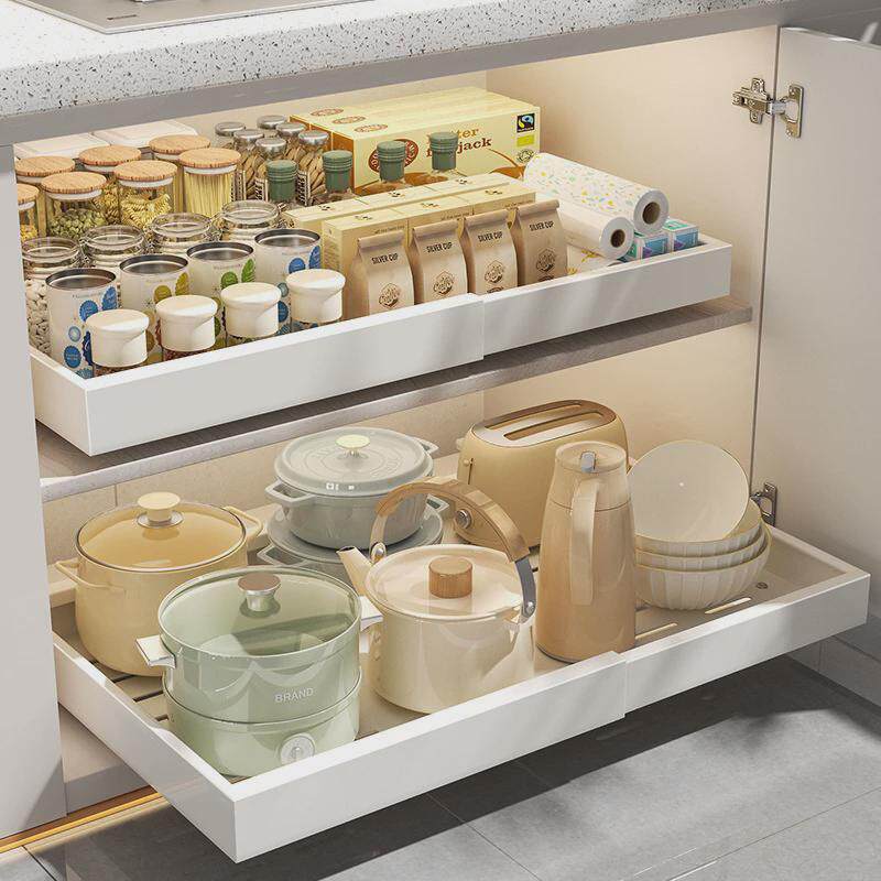 热销厨房抽屉式可伸缩橱柜内置超深柜拉篮抽拉式置物架锅具滑轨收