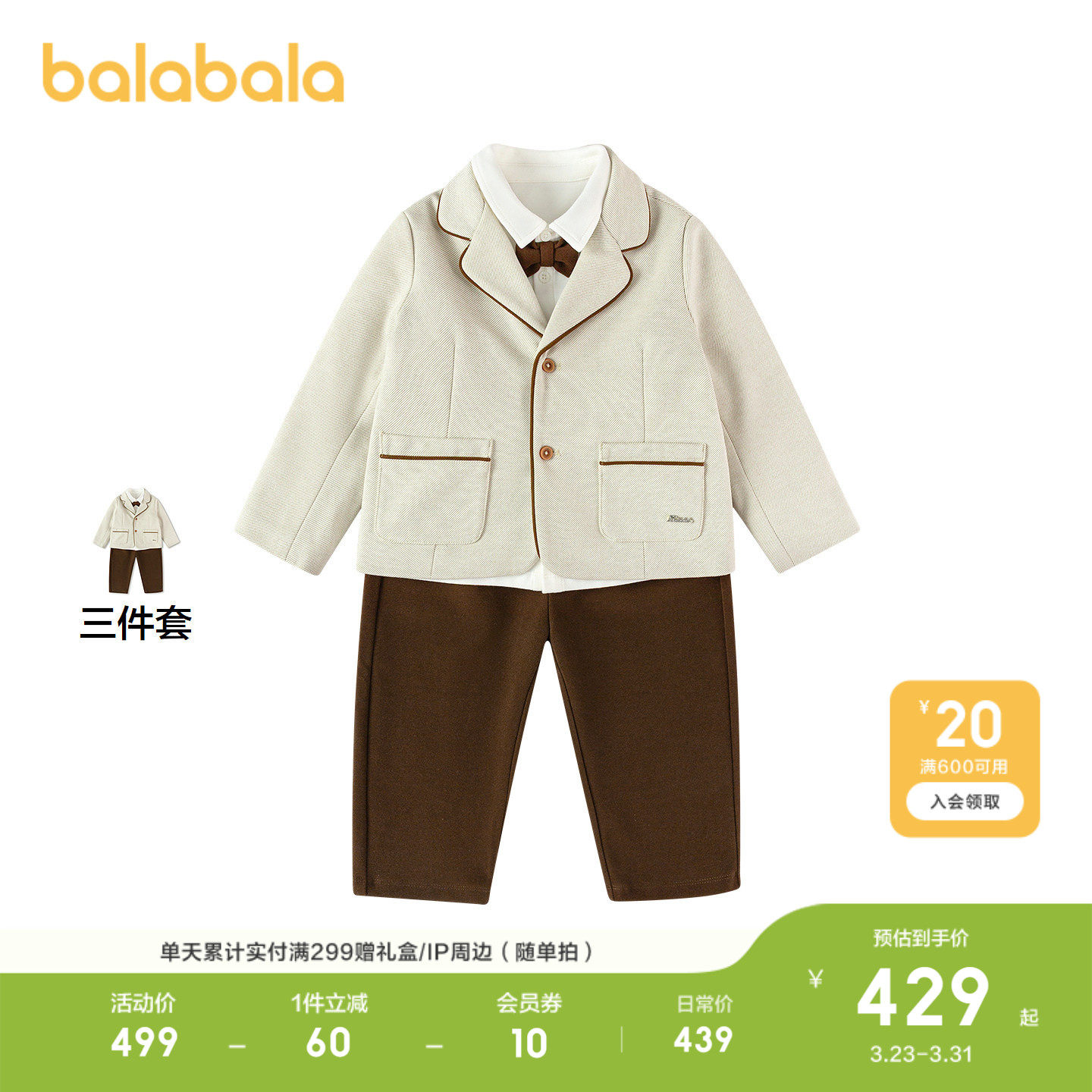 【商场同款】巴拉巴拉儿童套装男童2026新款春秋装正肩西装三件套