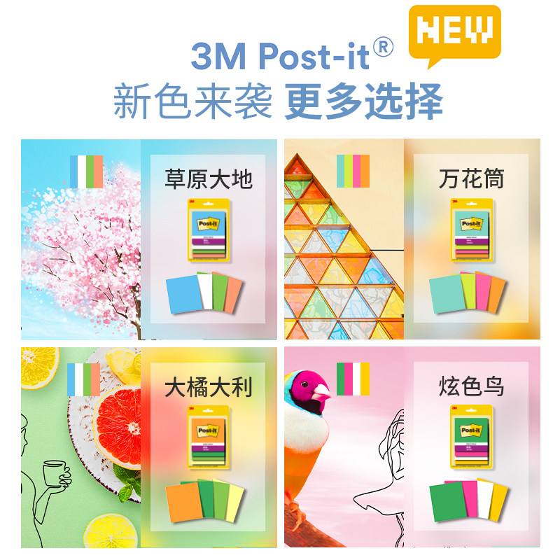 【色彩故事】美国3M便利贴狠贴学生用办公用品清新N次贴简约Post-it便条纸报事贴可撕便签本子文具23年新款