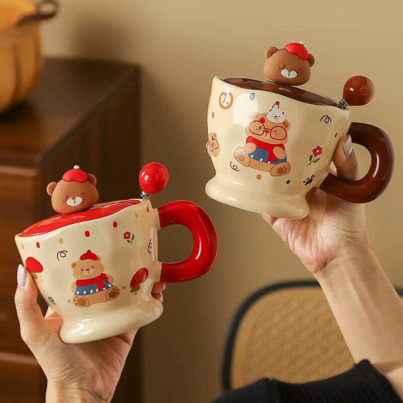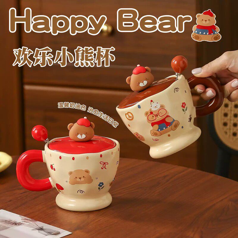 可爱小熊陶瓷马克杯带盖勺家用喝水杯情侣早餐咖啡牛奶杯生日礼物