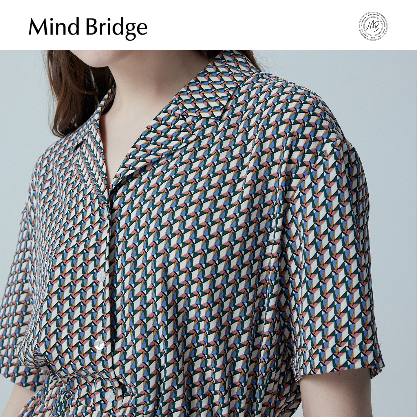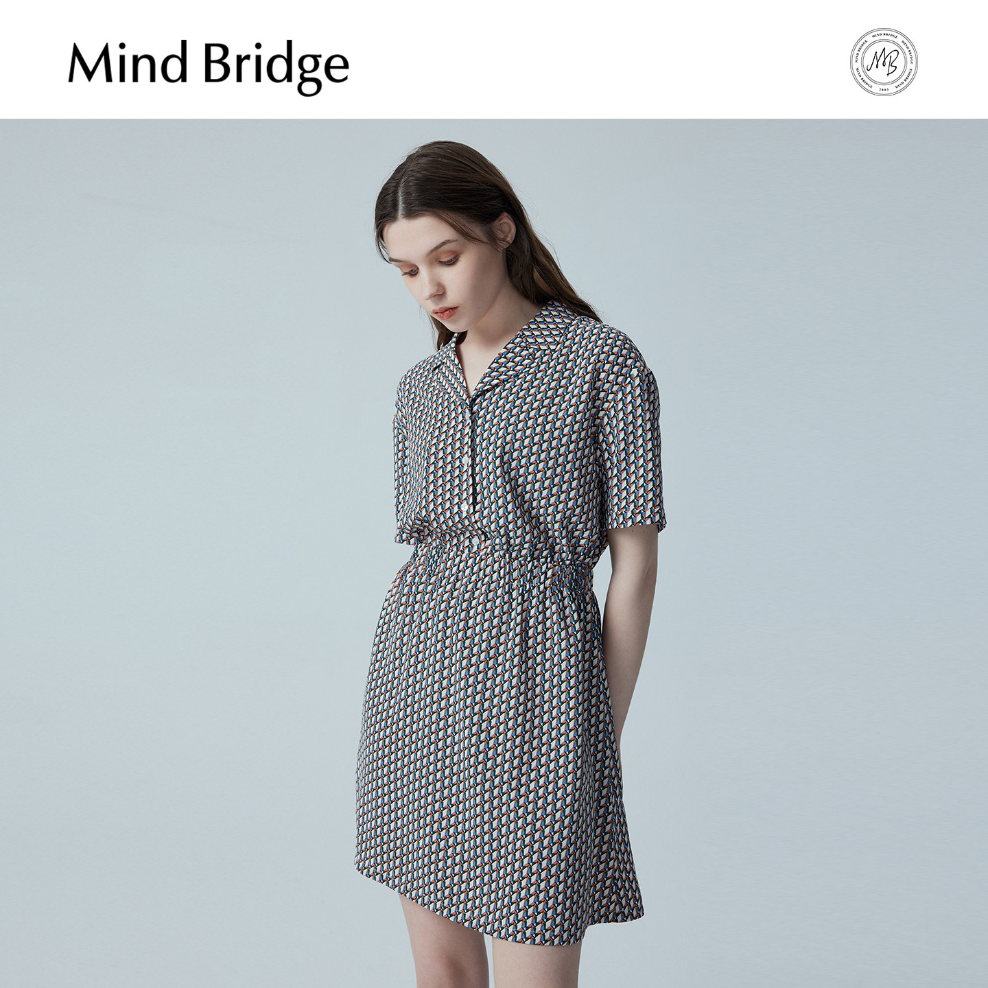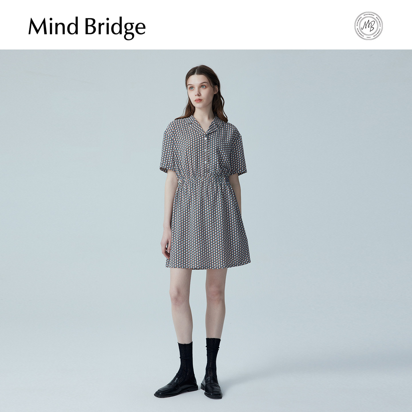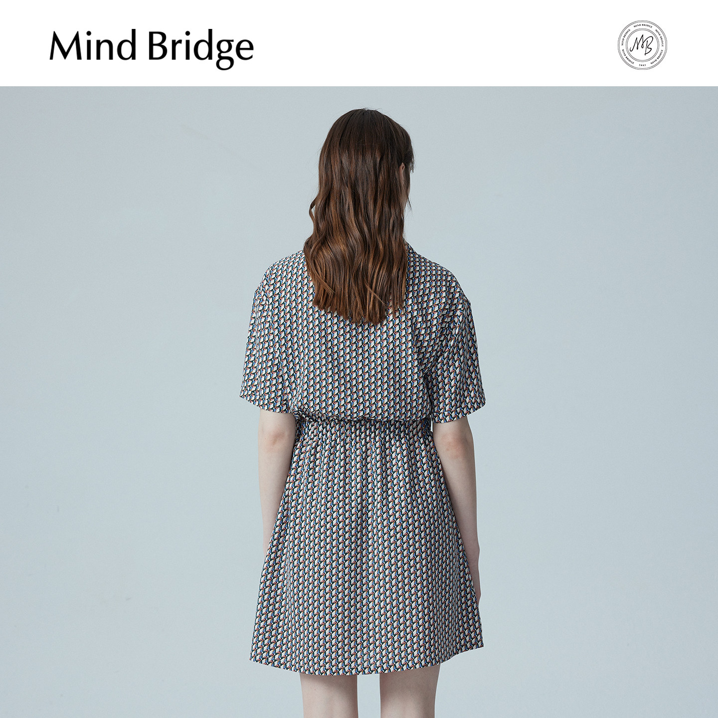 MB MindBridge百家好女士几何印花短袖连衣裙夏季复古西装领裙子
