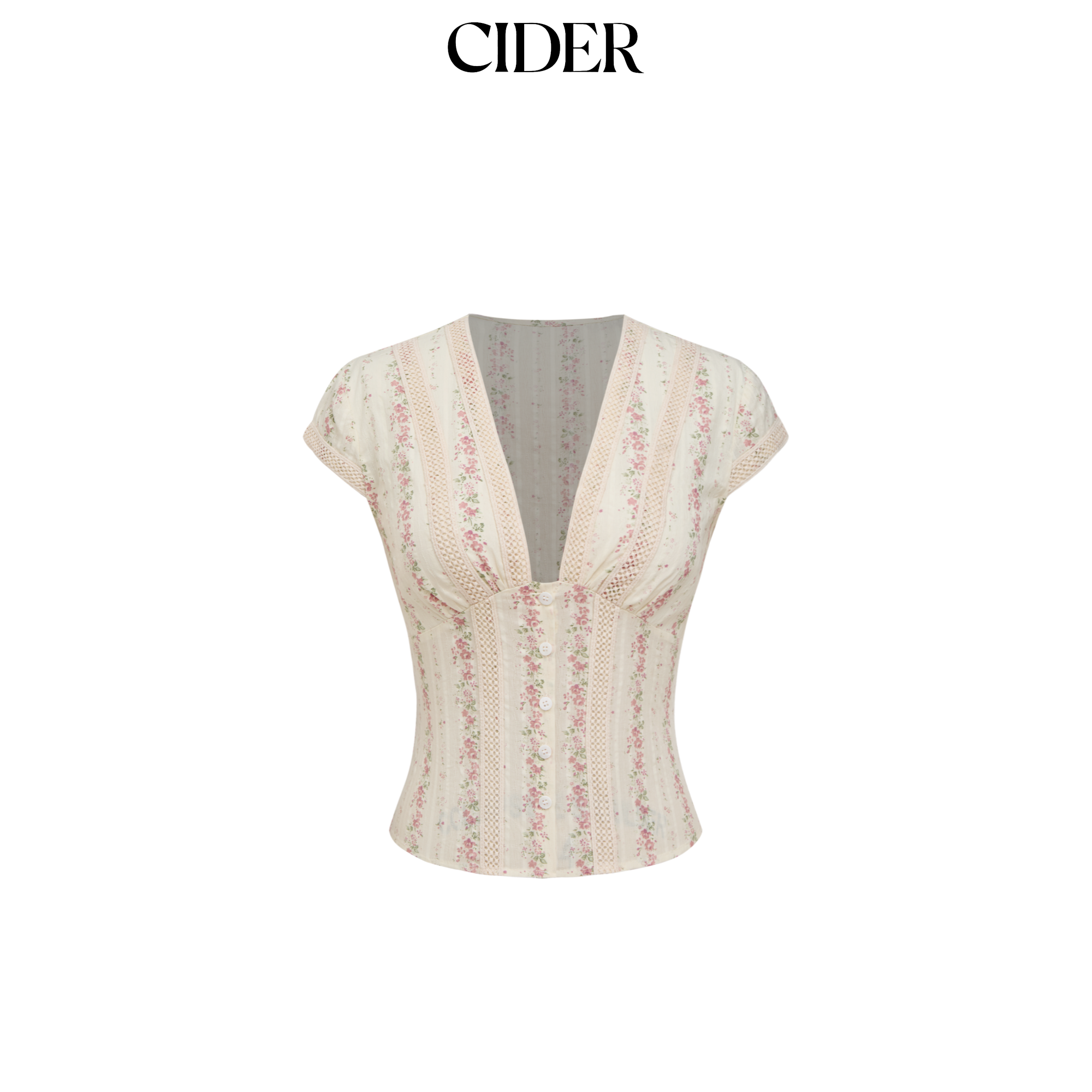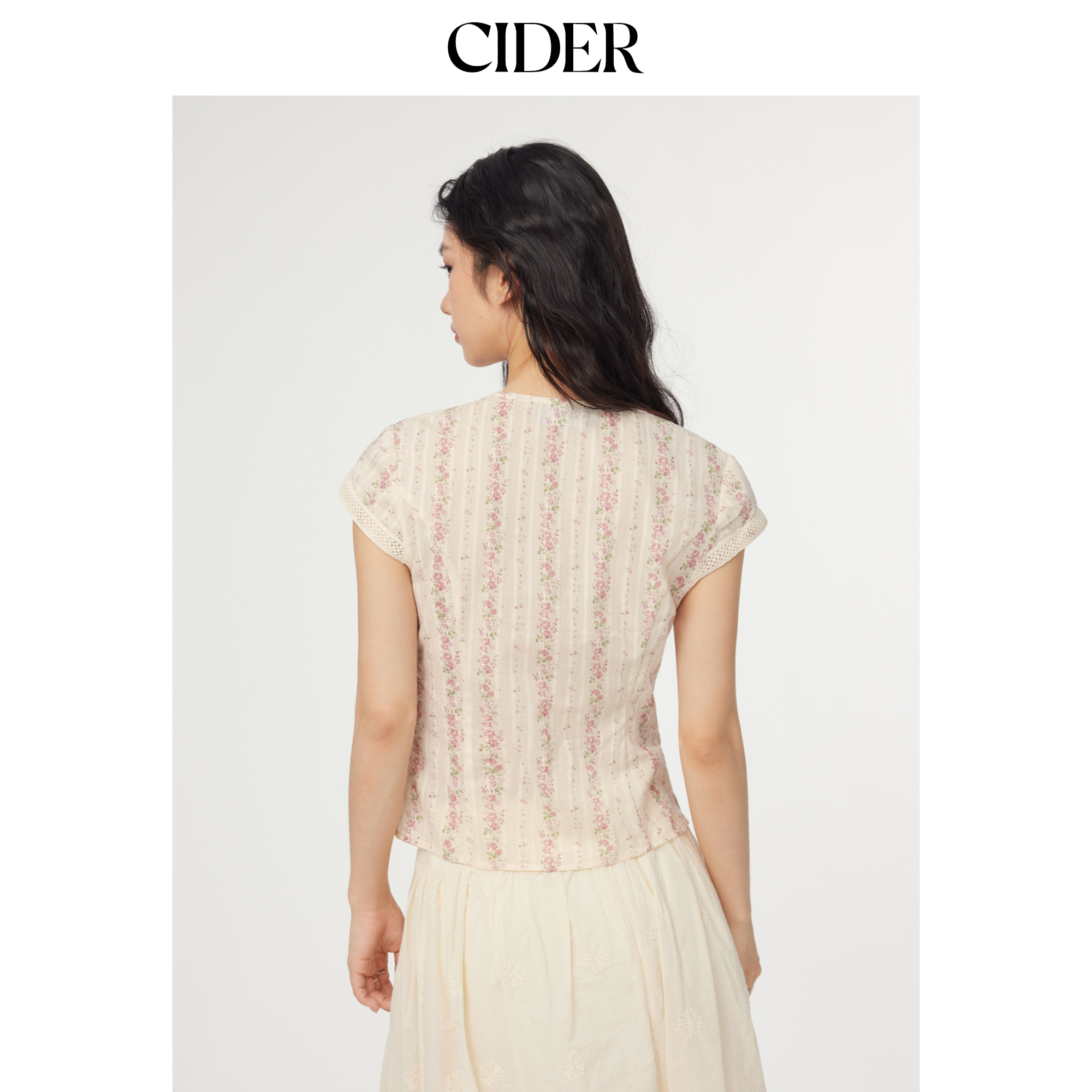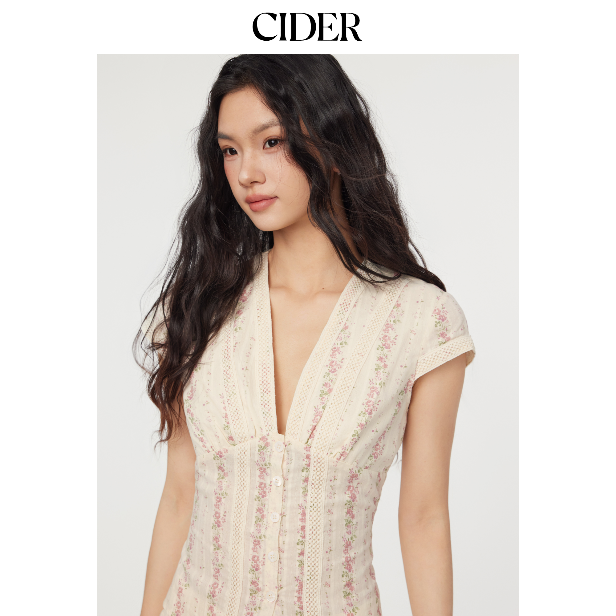 CIDER 夏季女装棉V领短款衬衫碎花短袖衬衣 114619020