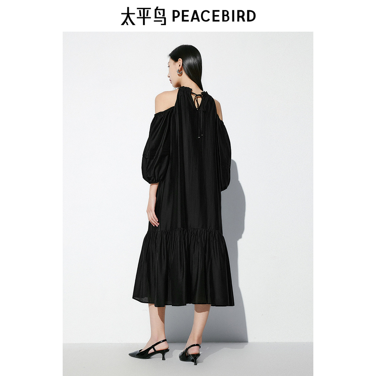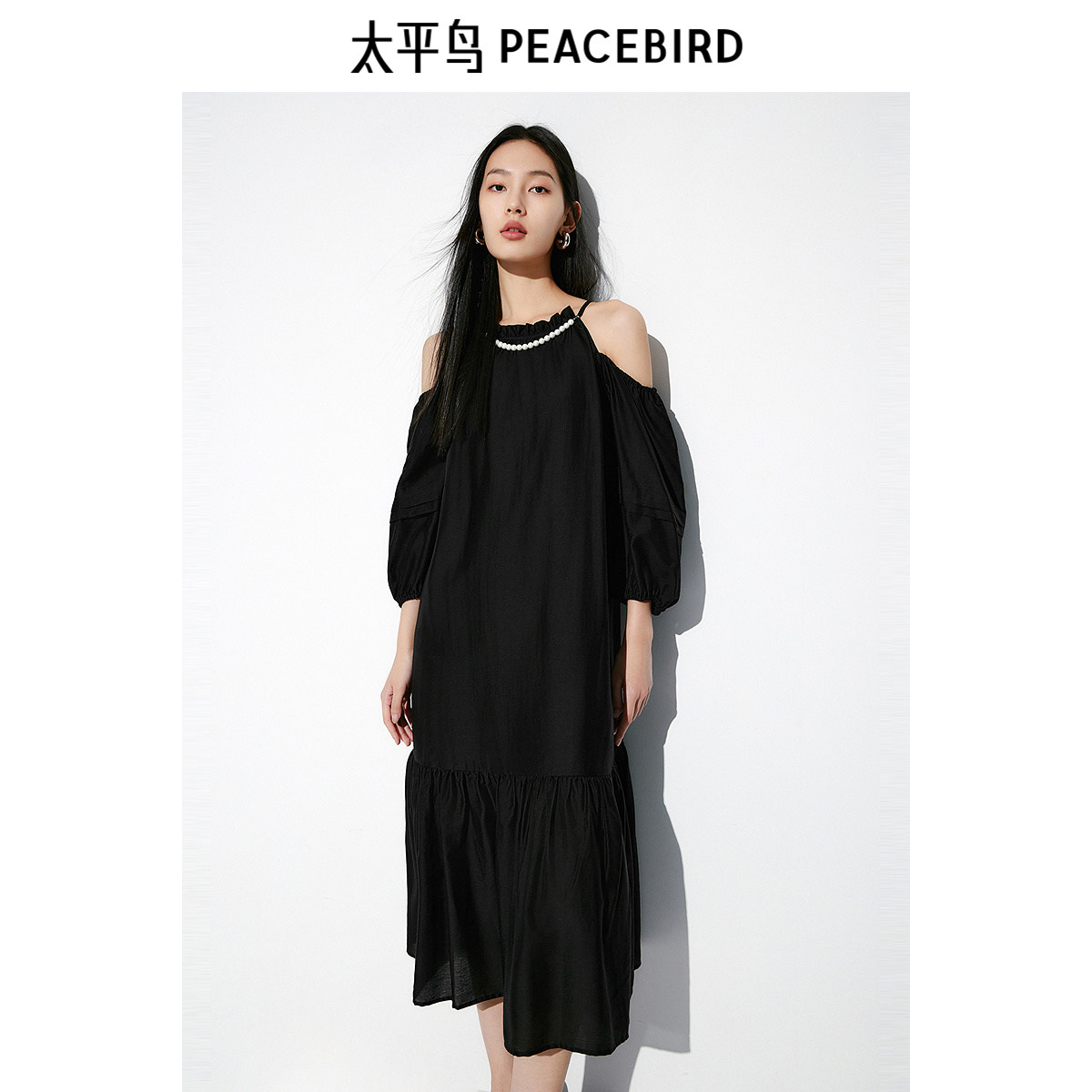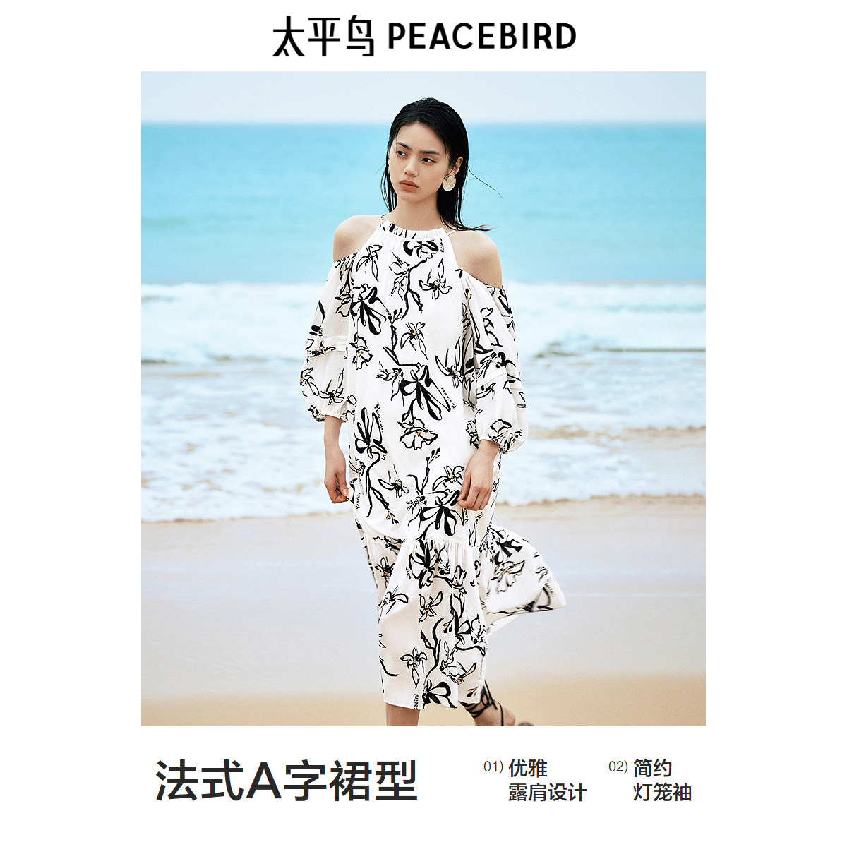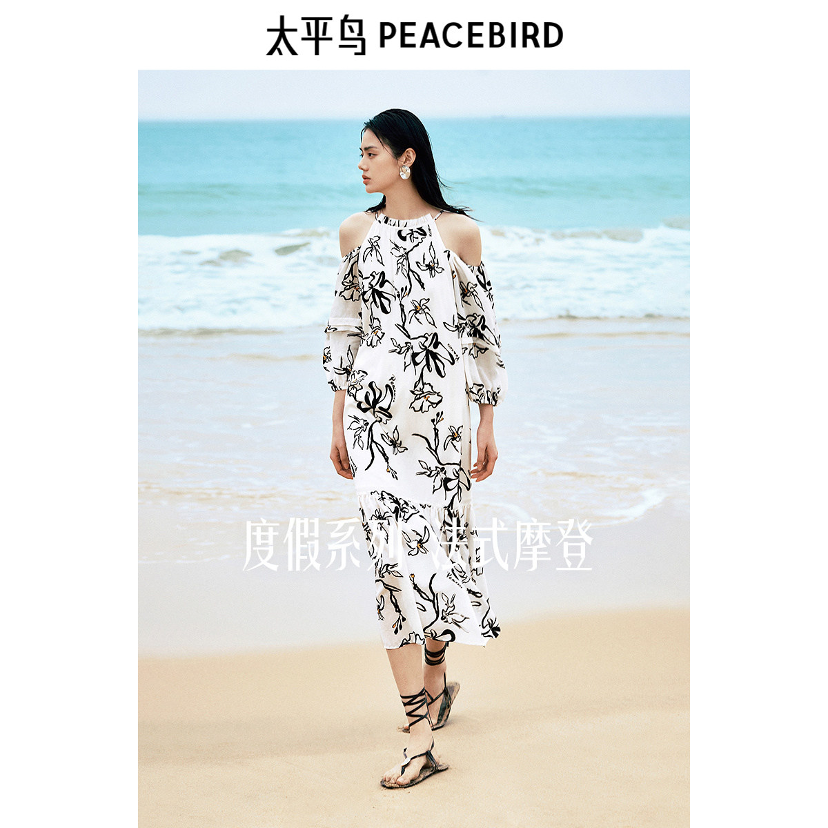太平鸟女装莱赛尔法式挂脖连衣裙夏季新款度假提花茶歇裙气质长裙
