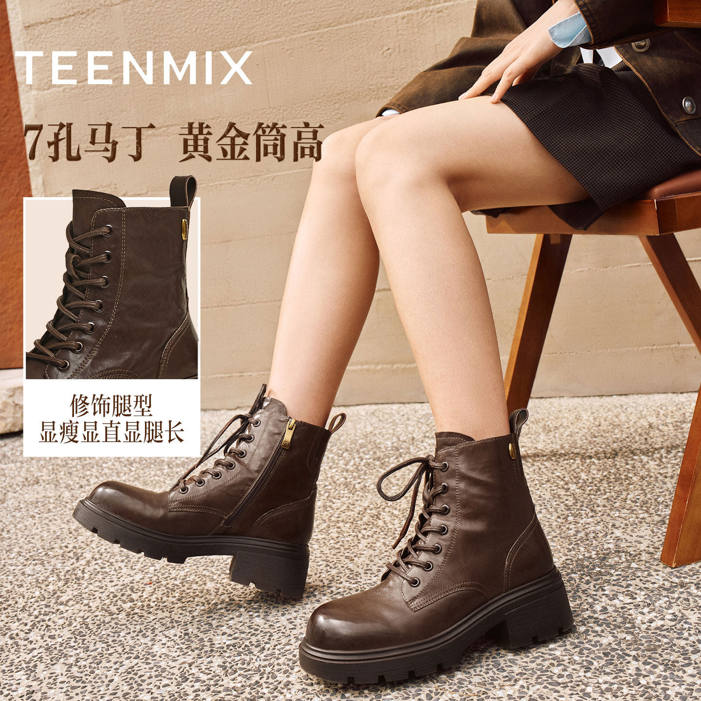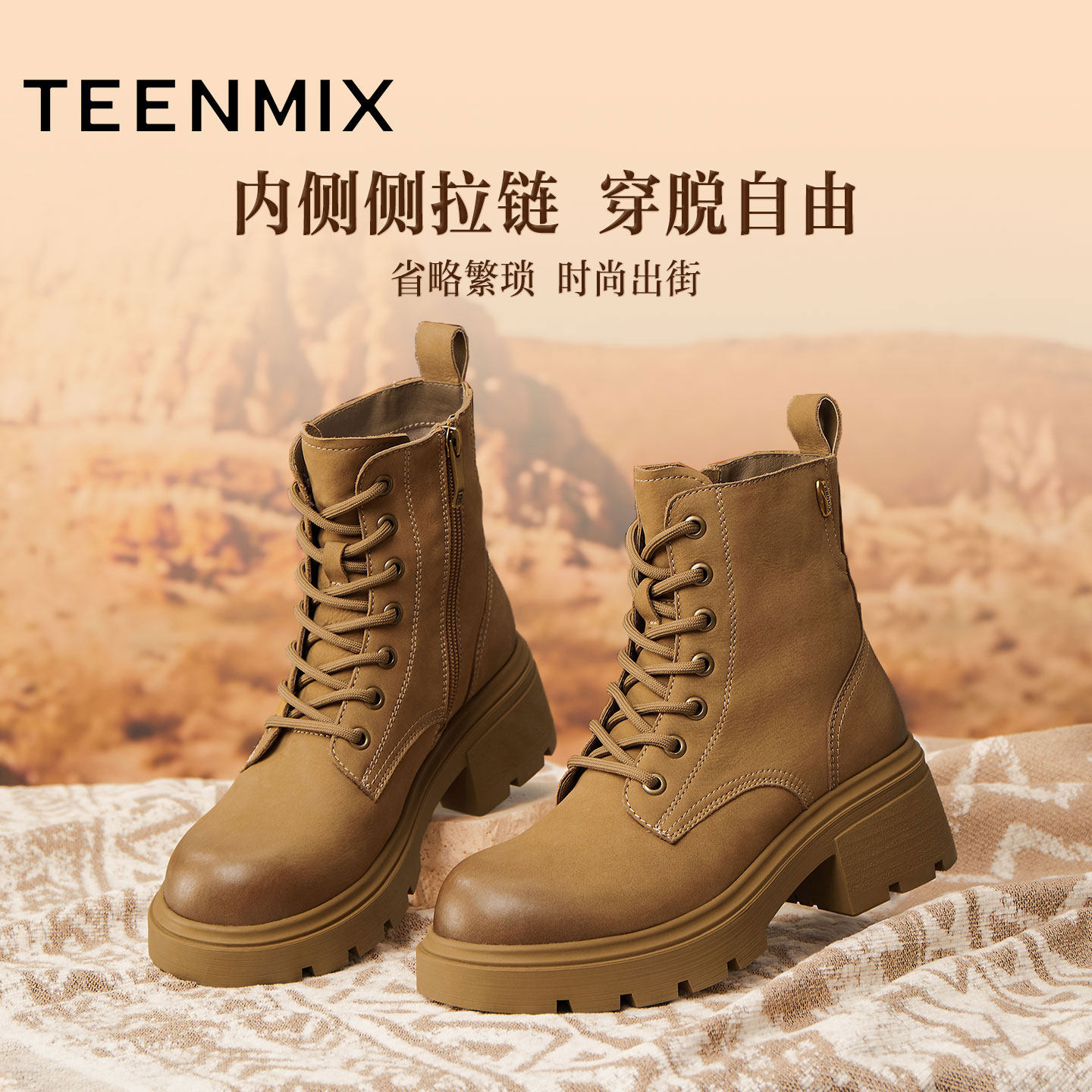 天美意粗跟厚底增高加绒英伦马丁靴女鞋子休闲短靴皮靴2025冬新款