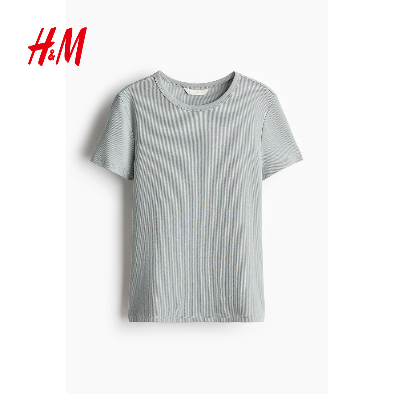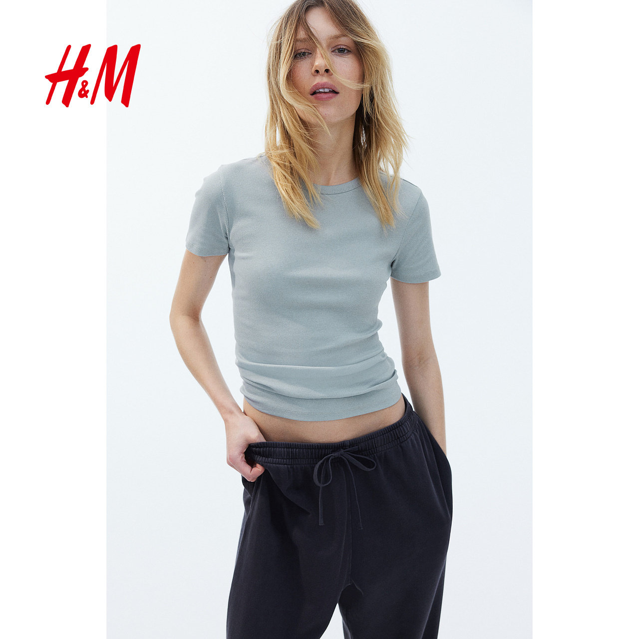 HM女装T恤2025冬季新款时尚修身短袖窄边领口直筒下摆上衣1260556